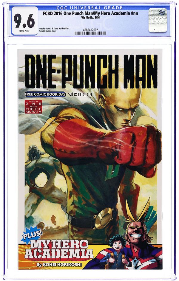Free Comic Book Day 2016 Edition - Written by One, and Kouhei Horikoshi. Art and cover by Yusuke Morata, and Kouhei Horikoshi. (First U.S. Appearance of One Punch Man!) Nothing about Saitama passes the eyeball test when it comes to superheroes, from his lifeless expression to his bald head to his unimpressive physique. However, this average-looking guy has a not-so-average problem - he just can't seem to find an opponent strong enough to take on! He is the One-Punch Man! Also: What would the world be like if 80% of the population manifested superpowers called "Quirks"? Heroes and villains would be battling it out everywhere! Being a hero would mean learning to use your power, but where would you go to study? The Hero Academy of course! But what would you do if you were one of the 20% percent who were born Quirkless? 32 pages, B&W NOTE: First appearance of One Punch Man in a U.S. comic book.