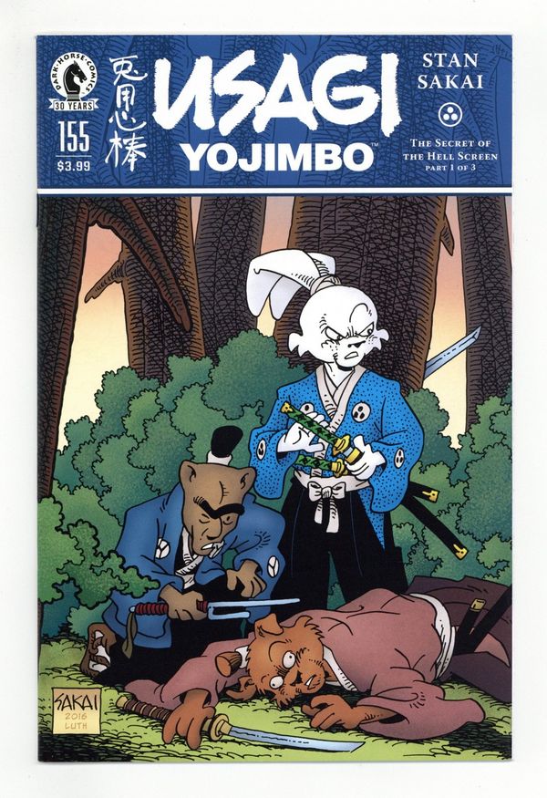 Published Jun 2016 by Dark Horse.$11.25Story, Art and Cover by Stan Sakai. The rabbit ronin arrives at an isolated temple and is surprised to find none other than the virtuous Inspector Ishida, investigating a brutal murder! Their only clue is a mysterious, massive, and potentially sentient painting depicting the torments of Hell. Legend has it that this, the hell Screen, will seek vengeance on any who displease it! What will happen when Usagi and Inspector Ishida attempt to solve the murder? 24 pages, B&W. Cover price $3.99.