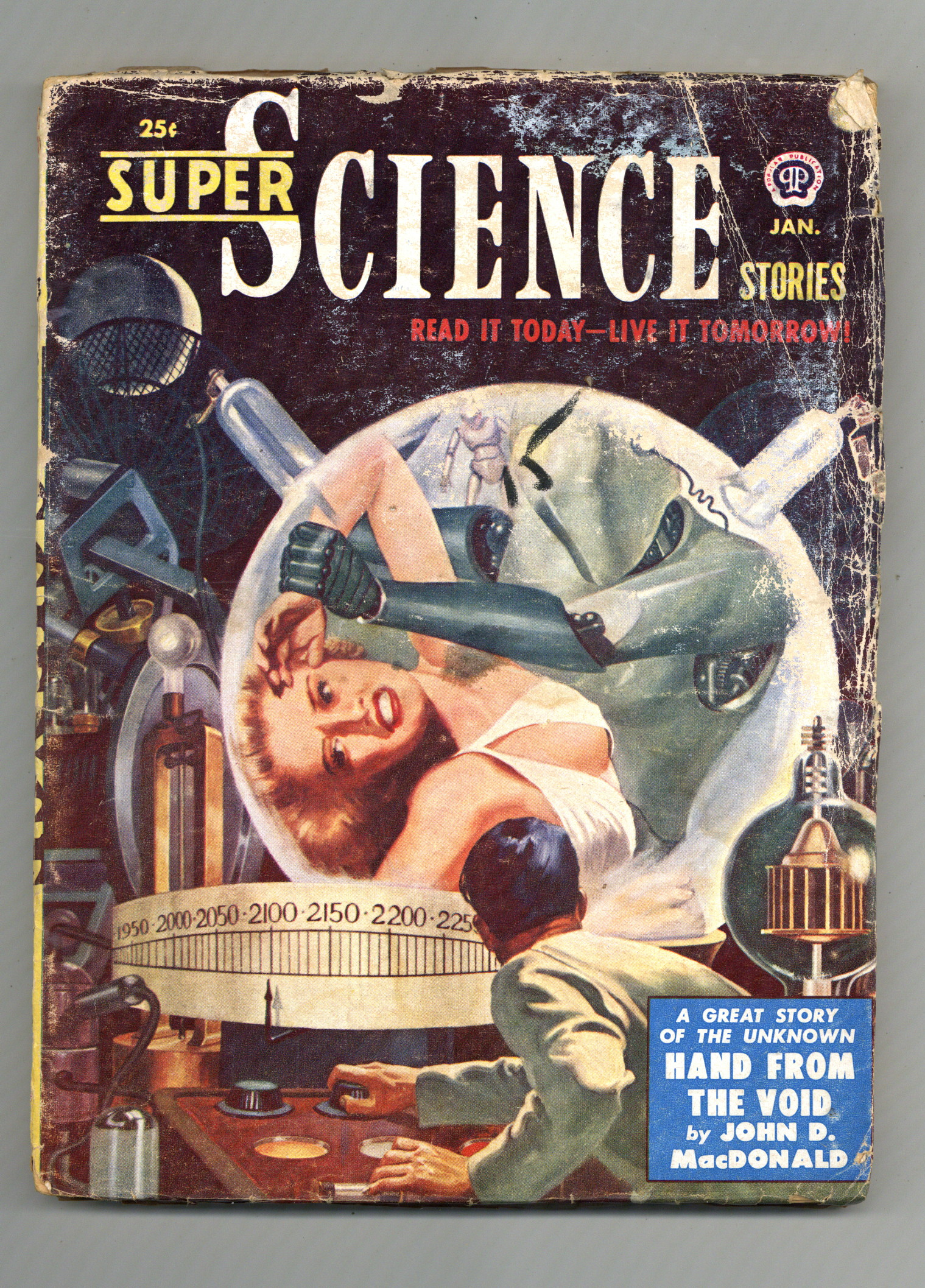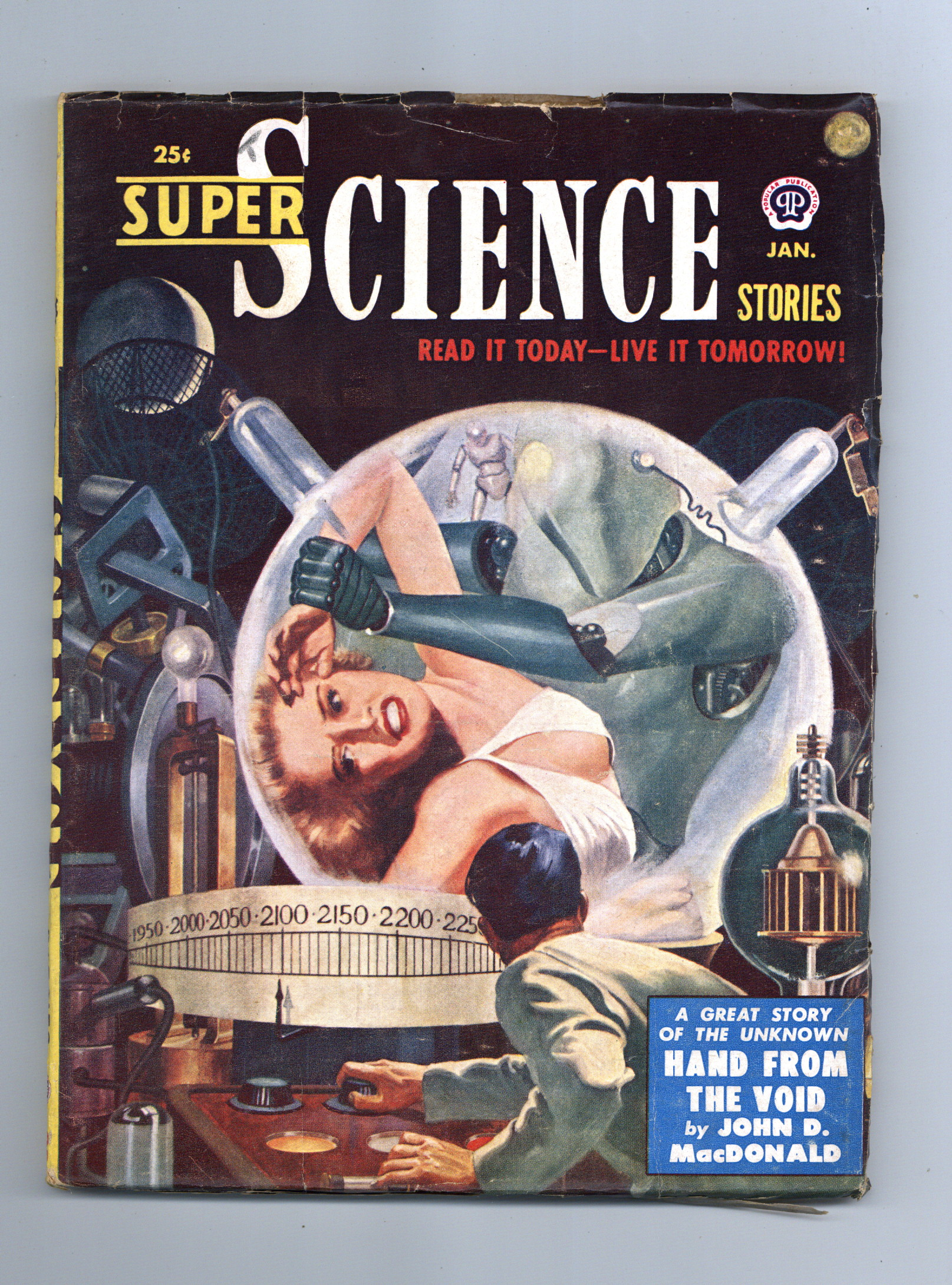 Volume 7, Issue 4 - January, 1951. Cover by Lawrence Stevens. Science Fiction stories: "Hand from the Void" by John D. MacDonald, "The Blood Star" by Chad Oliver & Garvin Berry, "Destiny Deferred" by John D. MacDonald (as John Wade Farrell), "Eternity Orbit" by Francis L. Ashton, "Rampart of Fear" by Benjamin Ferris, "First Life" by Roger Dee , and "Victory Unintentional [Robots]" by Isaac Asimov. Illustrations by Virgil Finlay, Lawrence Stevens, Paul, Van Dongen, and Fawcette. 7-in. x 9 1/2-in., 130 pages, black and white. Cover price $0.25.