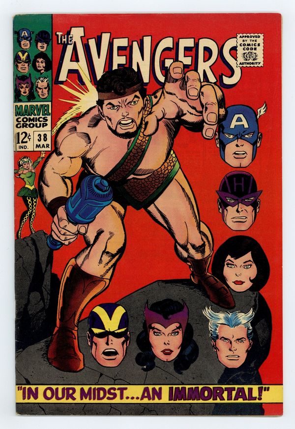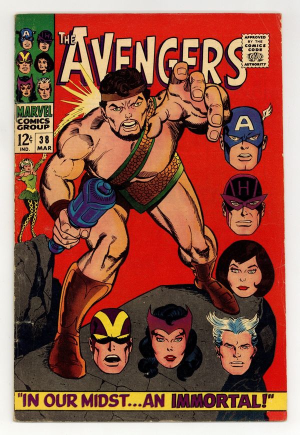 Tags: Marvel Legacy Numbering: Avengers (part 38), Avengers$20.00"In Our Midst An Immortal! Guest-starring Hercules. Script by Roy Thomas. Pencils by Don Heck. Inks by George Roussos (as George Bell). Cover by Gil Kane. The Mighty Avengers return to New York following their adventure in Europe. And shortly thereafter another argument breaks out concerning the Black Widow's membership on the team. While the debate rages on Fifth Avenue, a secret pact is formed in Olympus -- between Ares and the Enchantress! A while later an angry visitor smashes thru the outside wall of Avengers Mansion: the Prince of Power! Whoa, why is the Son of Zeusupset at Earth's Mightiest Heroes? Once the Avengers see the Asgardian sorceress standing behind him...they surmise what's happened. And the battle of mortals vs. immortals begins! Goliath, Hawkeye, Pietro, Wanda, and theWasp vs. Hercules and the Enchantress! Who will get the last word? Meanwhile, SHIELD secretly contacts the Black Widow about a special spy mission behind the Bamboo Curtain. Cameo appearances by Jarvis, Nick Fury, Dum Dum Dugan, Jasper Sitwell, Captain America, Power Man (aka Erik Josten), Swordsman, and Zeus. (Notes: Hercules previously appeared in Thor (1st series) 131. This story was reprinted in Marvel Triple Action #30. The issue includes a statement of ownership: average print run 423,601; average paid circulation 269,994.) 36 pages. Cover price $0.12.