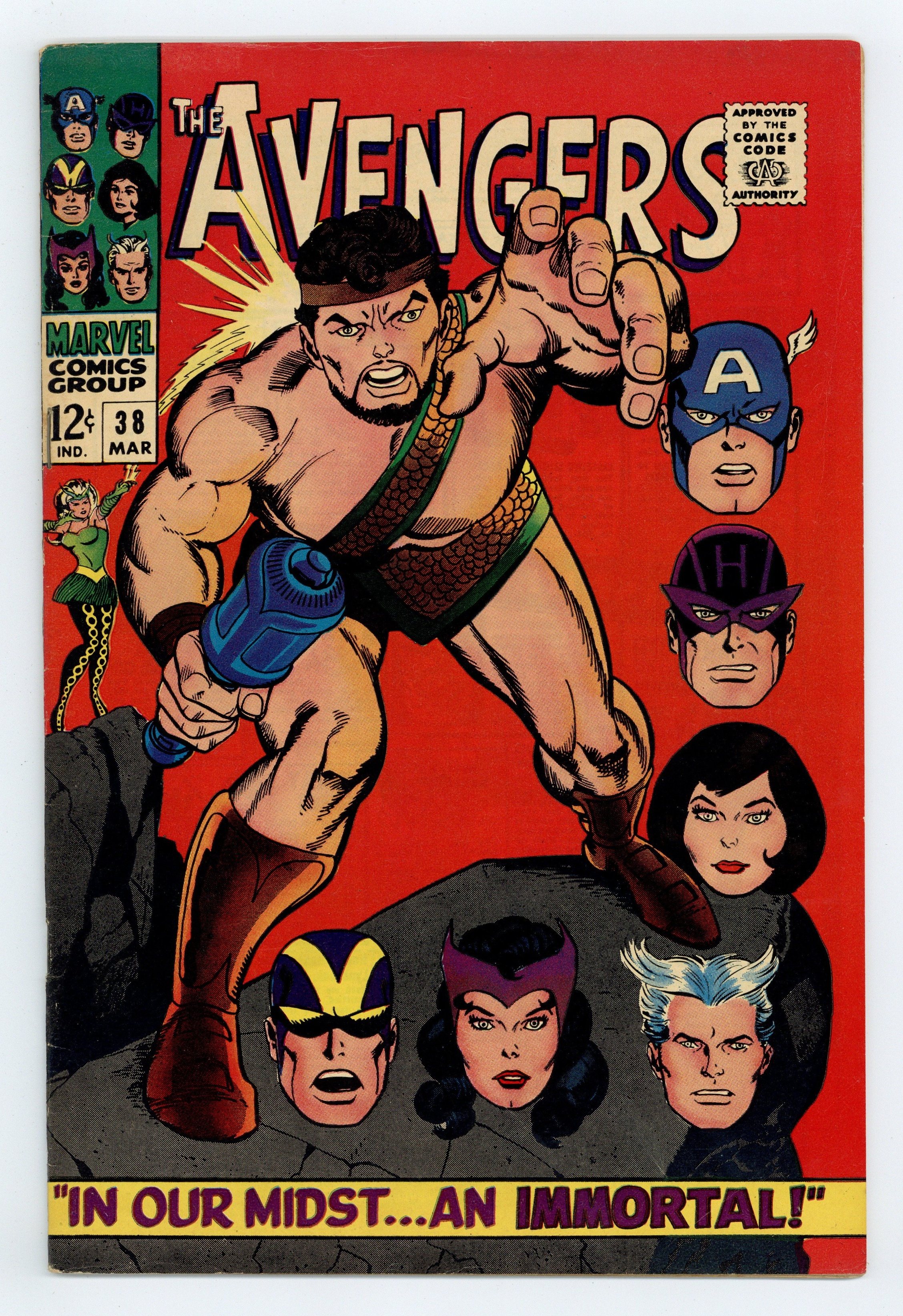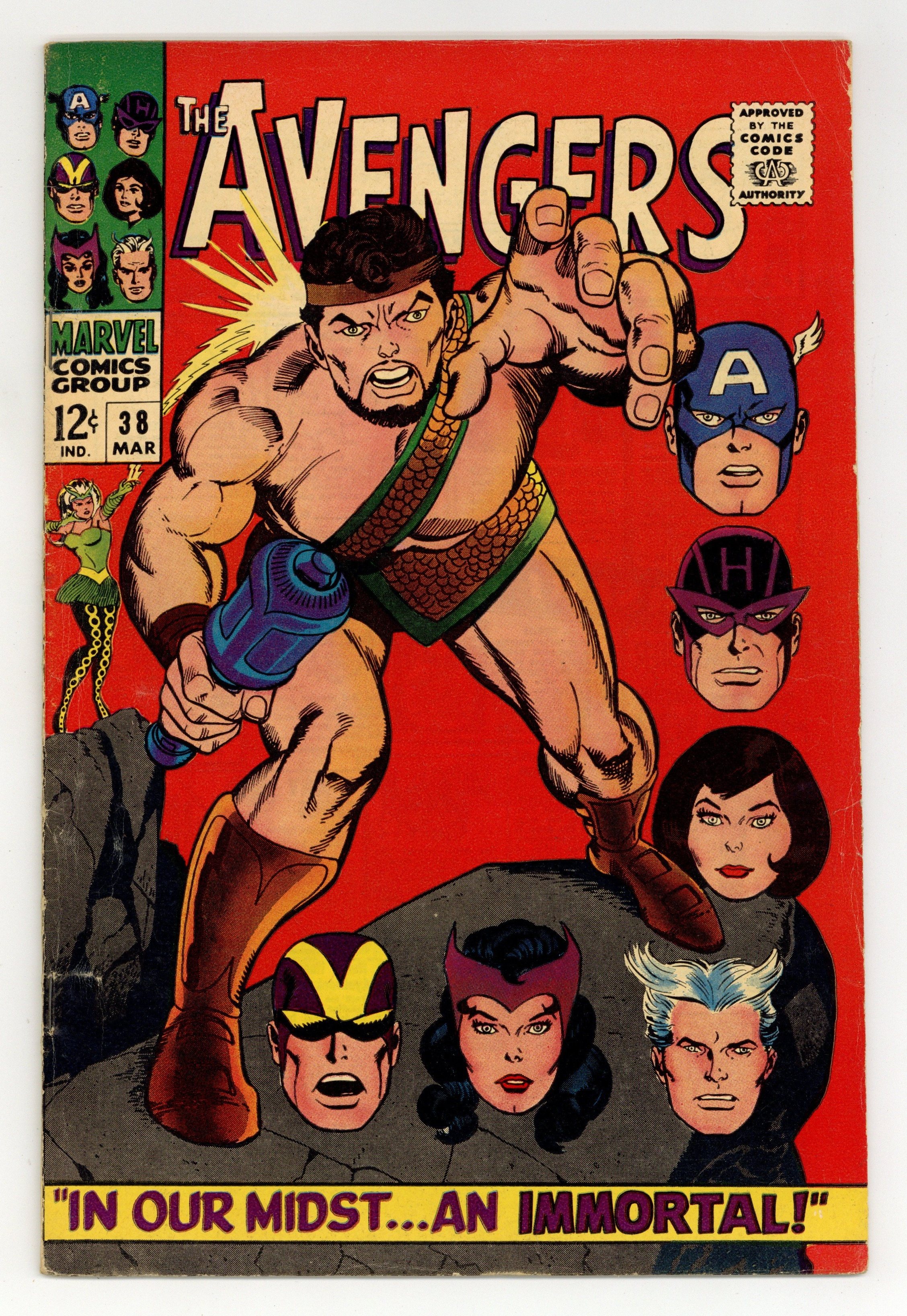 "In Our Midst An Immortal! Guest-starring Hercules. Script by Roy Thomas. Pencils by Don Heck. Inks by George Roussos (as George Bell). Cover by Gil Kane. The Mighty Avengers return to New York following their adventure in Europe. And shortly thereafter another argument breaks out concerning the Black Widow's membership on the team. While the debate rages on Fifth Avenue, a secret pact is formed in Olympus -- between Ares and the Enchantress! A while later an angry visitor smashes thru the outside wall of Avengers Mansion: the Prince of Power! Whoa, why is the Son of Zeusupset at Earth's Mightiest Heroes? Once the Avengers see the Asgardian sorceress standing behind him...they surmise what's happened. And the battle of mortals vs. immortals begins! Goliath, Hawkeye, Pietro, Wanda, and theWasp vs. Hercules and the Enchantress! Who will get the last word? Meanwhile, SHIELD secretly contacts the Black Widow about a special spy mission behind the Bamboo Curtain. Cameo appearances by Jarvis, Nick Fury, Dum Dum Dugan, Jasper Sitwell, Captain America, Power Man (aka Erik Josten), Swordsman, and Zeus. (Notes: Hercules previously appeared in Thor (1st series) 131. This story was reprinted in Marvel Triple Action #30. The issue includes a statement of ownership: average print run 423,601; average paid circulation 269,994.) 36 pages. Cover price $0.12.
