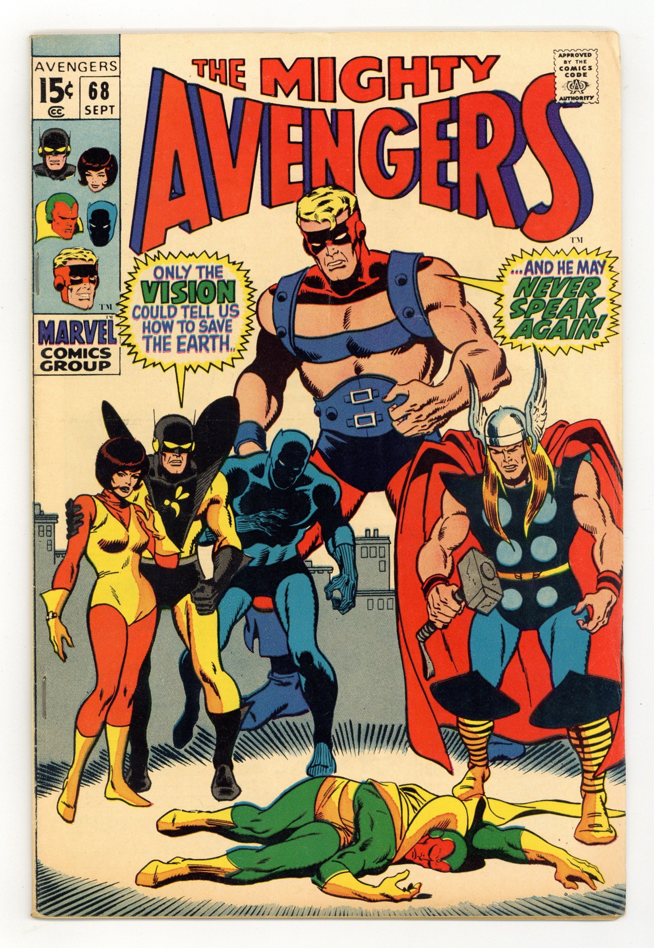"And We Battle for the Earth!" Part 3 of 3. Script by Roy Thomas. Pencils by Sal Buscema. Inks by Sam Grainger. Cover by Sal Buscema and Sam Grainger. Inside Ultron's underground fortress, the Avengers halt the adamantium robot's plan to turn New York into a nuclear wasteland! Unfortunately though, the metal despot escapes and remains a deadly threat! So Hank Pym and Dr. Myron MacLain set a trap for Ultron-6 at the United Nations Headquarters. But the powerful robot storms into the U.N. as a full-bodied robot! Uh-oh, Earth's Mightiest Heroes were not expecting that! Will Thorand Goliath be able to keep the awesome Ultron at bay while Yellowjacket's plan takes time to develop? The world is holding its breath! Avengers Lineup: Black Panther, Goliath, Thor, Vision, Wasp, and Yellowjacket. (Notes: Ultron returns (as Ultron-7) in Avengers 127 and Fantastic Four 150. This story was reprinted in Marvel Super Action #29.) 36 pages. Cover price $0.15.