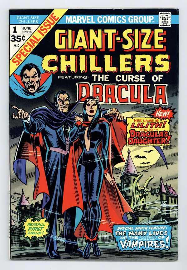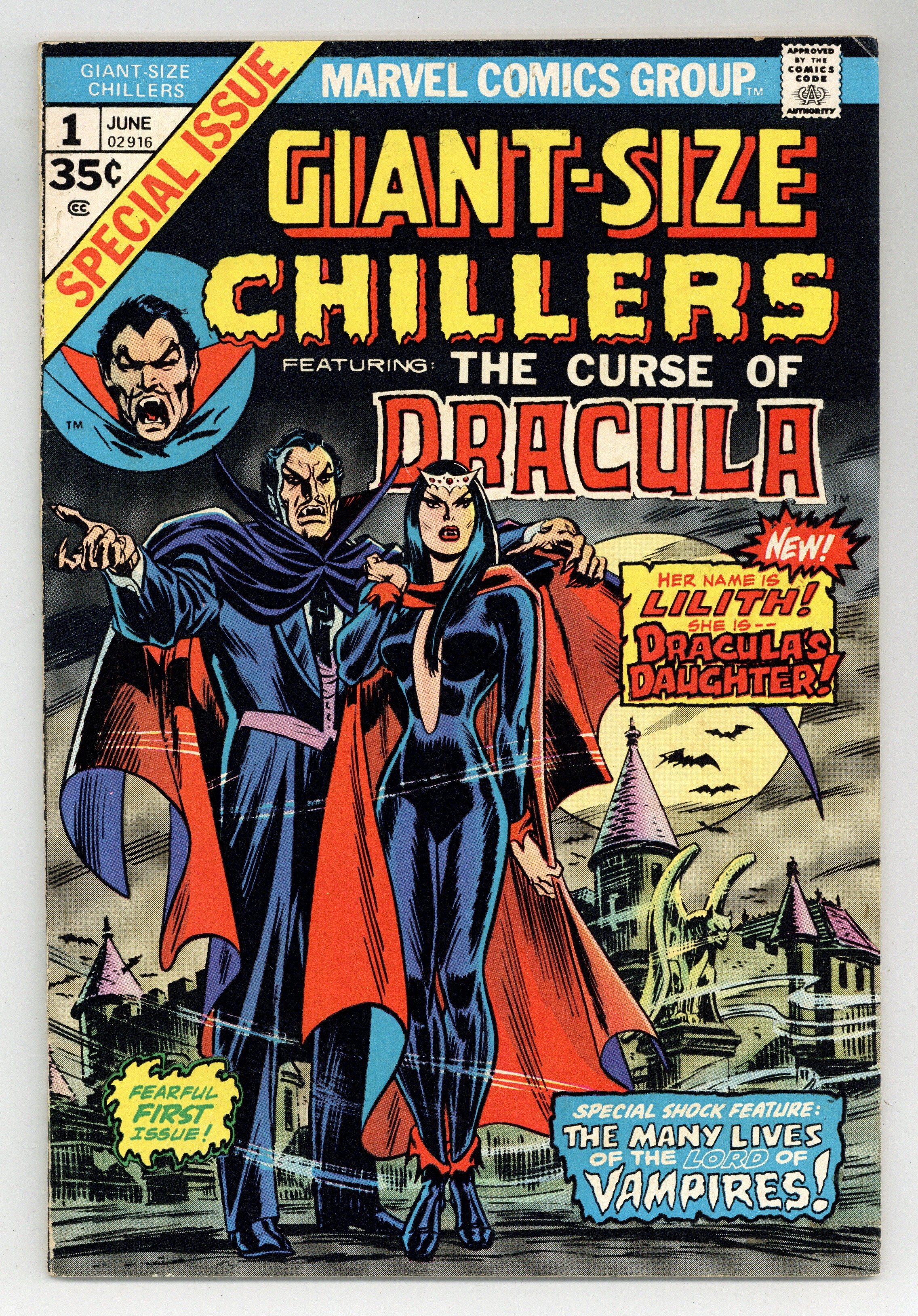 $100.0052-page giant. Origin and 1st appearance of Lilith (Dracula's daughter) in a new Dracula story, "Night of the She-Demon." Script by Marv Wolfman, pencils by Gene Colan, inks by Frank Chiaramonte. Two-page text history of Dracula in Marvel Comics by Wolfman. Reprints: "Have You Ever Seen a Huge, Black Vampire" (script by Stan Lee, art by John Romita Sr. from Mystic 25); "The Village Graveyard" (art by Russ Heath from Weird Worlds 4). Romita cover. Title becomes Giant-Size Dracula with # 2. Cover price $0.35.