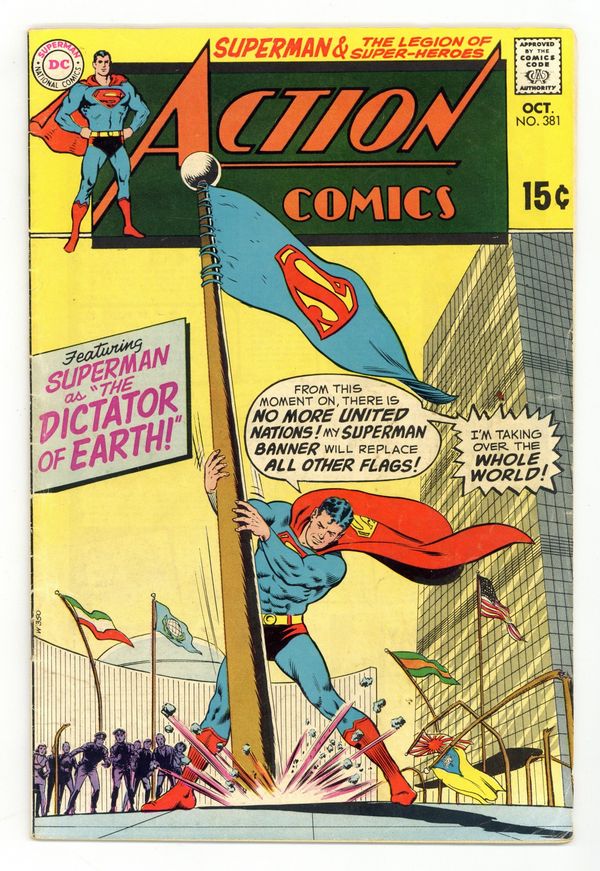Tags: Superman$15.00Cover pencils by Curt Swan, inks by Murphy Anderson. "The Dictator of Earth!", script by Leo Dorfman, pencils by Curt Swan, inks by George Roussos; Superman decides not to expose himself to Gold Kryptonite and instead agrees to stand trial at the United Nations for his apparent misdeeds. Tales of the Legion of Super-Heroes backup, "The Hapless Hero!", script by Jim Shooter, pencils by Win Mortimer, inks by Jack Abel; While other Legionnaires spend time with their families, Matter-Eater Lad has an argument with his father; He ends up back at Legion headquarters where Shrinking Violet complains about her boyfriend troubles; Appearances by Matter-Eater Lad, Shrinking Violet, Duplicate Boy, Braniac 5, Chemical King, Saturn Girl, Ultra Boy, Phantom Girl, and Projectra. Half-page Super-Turtle gag by Henry Boltinoff. Batman ad. 36 Pages, Full Color. $0.15 Cover price $0.15.