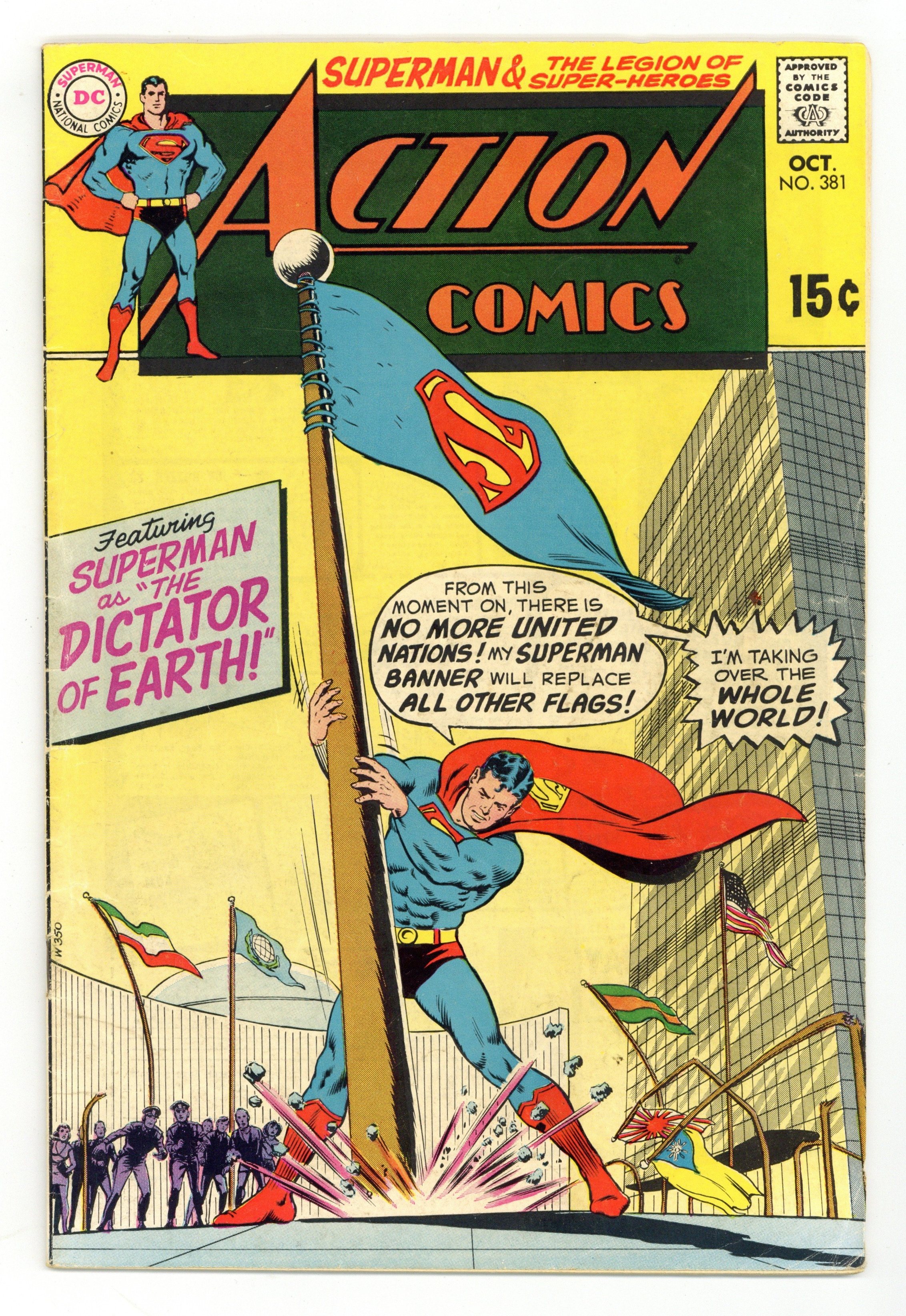 Tags: Superman$28.50Cover pencils by Curt Swan, inks by Murphy Anderson. "The Dictator of Earth!", script by Leo Dorfman, pencils by Curt Swan, inks by George Roussos; Superman decides not to expose himself to Gold Kryptonite and instead agrees to stand trial at the United Nations for his apparent misdeeds. Tales of the Legion of Super-Heroes backup, "The Hapless Hero!", script by Jim Shooter, pencils by Win Mortimer, inks by Jack Abel; While other Legionnaires spend time with their families, Matter-Eater Lad has an argument with his father; He ends up back at Legion headquarters where Shrinking Violet complains about her boyfriend troubles; Appearances by Matter-Eater Lad, Shrinking Violet, Duplicate Boy, Braniac 5, Chemical King, Saturn Girl, Ultra Boy, Phantom Girl, and Projectra. Half-page Super-Turtle gag by Henry Boltinoff. Batman ad. 36 Pages, Full Color. $0.15 Cover price $0.15.