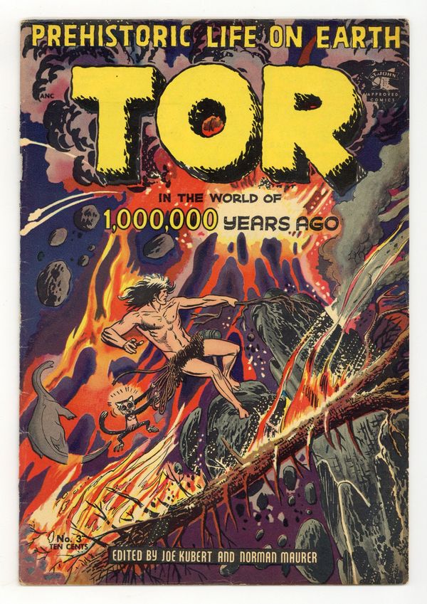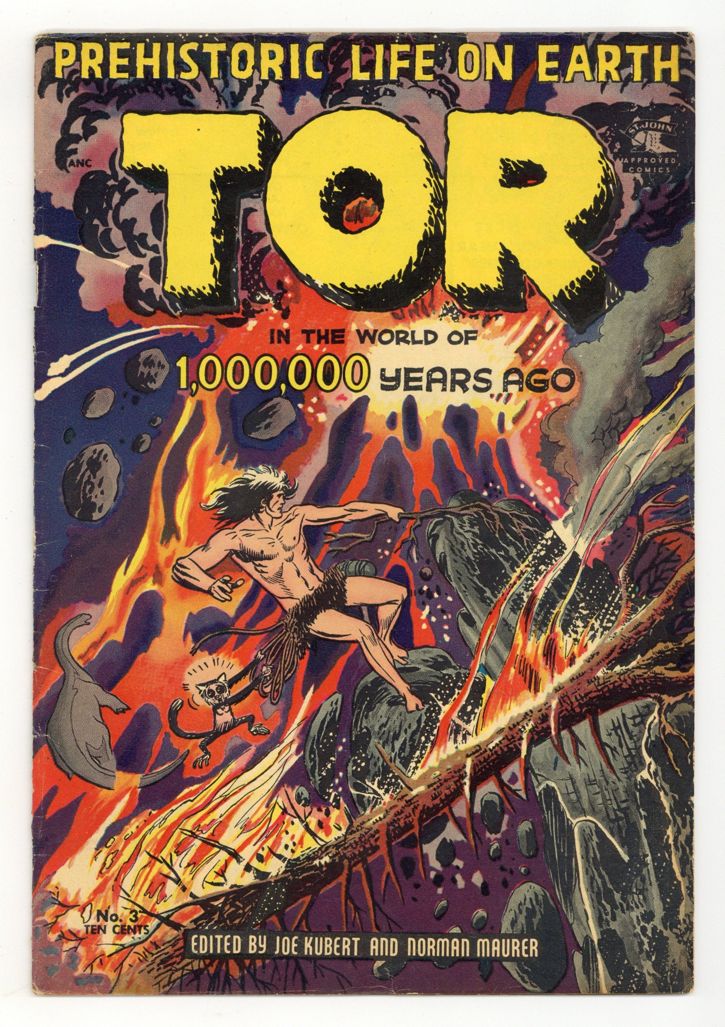 Starts Apr 4 Cover by Joe Kubert. Stories and art by Joe Kubert, Alex Toth and Norman Maurer. Numbering continues from 3-D Comics Tor (1953 St. John) #2C. Comics legend Joe Kubert won fans early in his career with his tales of Tor, a caveman struggling for survival in a world where humans co-exist with dinosaurs. Tor tries to help a tribe escape a volcanic island that is collapsing into the sea. Tor defends a village from the raiding Flatnose tribe, and helps an all-female tribe settle differences with their neighbors. Co-creators Joe Kubert and Norman Maurer put themselves into the comic to discuss the science and history of the Tor series. Plus full-page dinosaur illustrations (including a pteranodon) by Kubert. Isle of Fire!; Snow Trap; Black Valley; 1,000,000 B.C. History of Prehistoric Animals: Pteranodon, Tylosaurus; Danny Dreams. 32 pages, Full Color. Cover price $0.10.