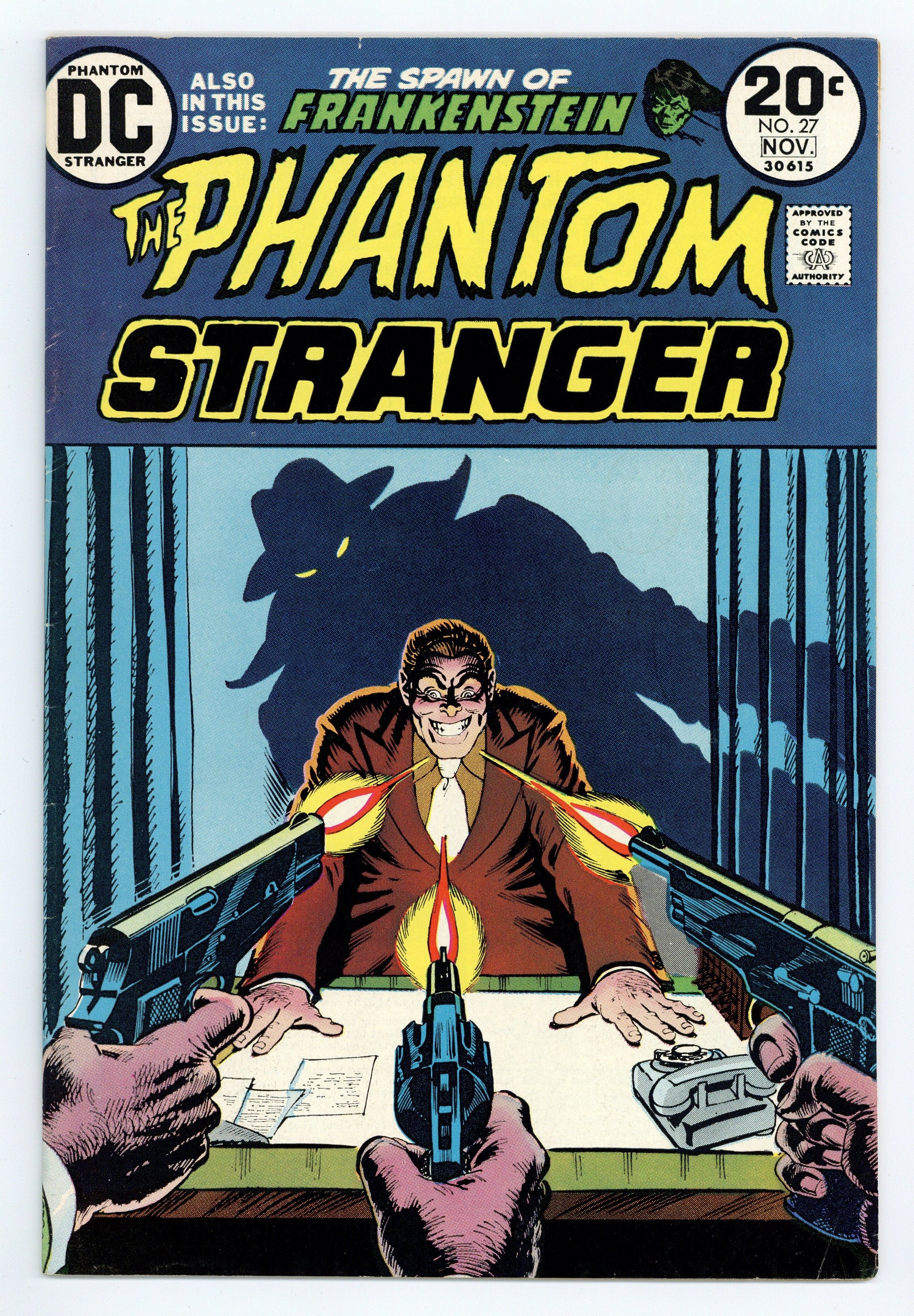 Cover art by Nick Cardy. "Dr. Zorn: Soul-Master," script by Arnold Drake, art by Gerry Talaoc; When the Phantom Stranger is present when a famous musician goes mad during one of his performances, he follows him to his doctor: Matthew Zorn. Zorn has a very famous clientele including celebrities and military personnel; The Stranger feigns illness so that he can go and see the doctor, and is given one of his special "medicines" which creates a powerful hallucination in which Phantom Stranger is ruler of the world; Shaking off the effects of the drugs, Phantom Stranger decides to investigate further. "The Terror and the Compassion," script by Steve Skeates, art by Bernard Baily; The Spawn of Frankenstein awakens from a dream to find a young woman about to be raped by her date; The Spawn scares the man and woman, and carries the fainted woman to safety; However, the man revives and tries to run down the Spawn, but the monsters strength and durability only ends up wrecking the car and not harming the monster; When the girl revives from her spell, she flees the monster and tries to get away, she ends up running into a cult who wishes to use her as a sacrifice in one of their black masses. 36 pgs., full color. Cover price $0.20.