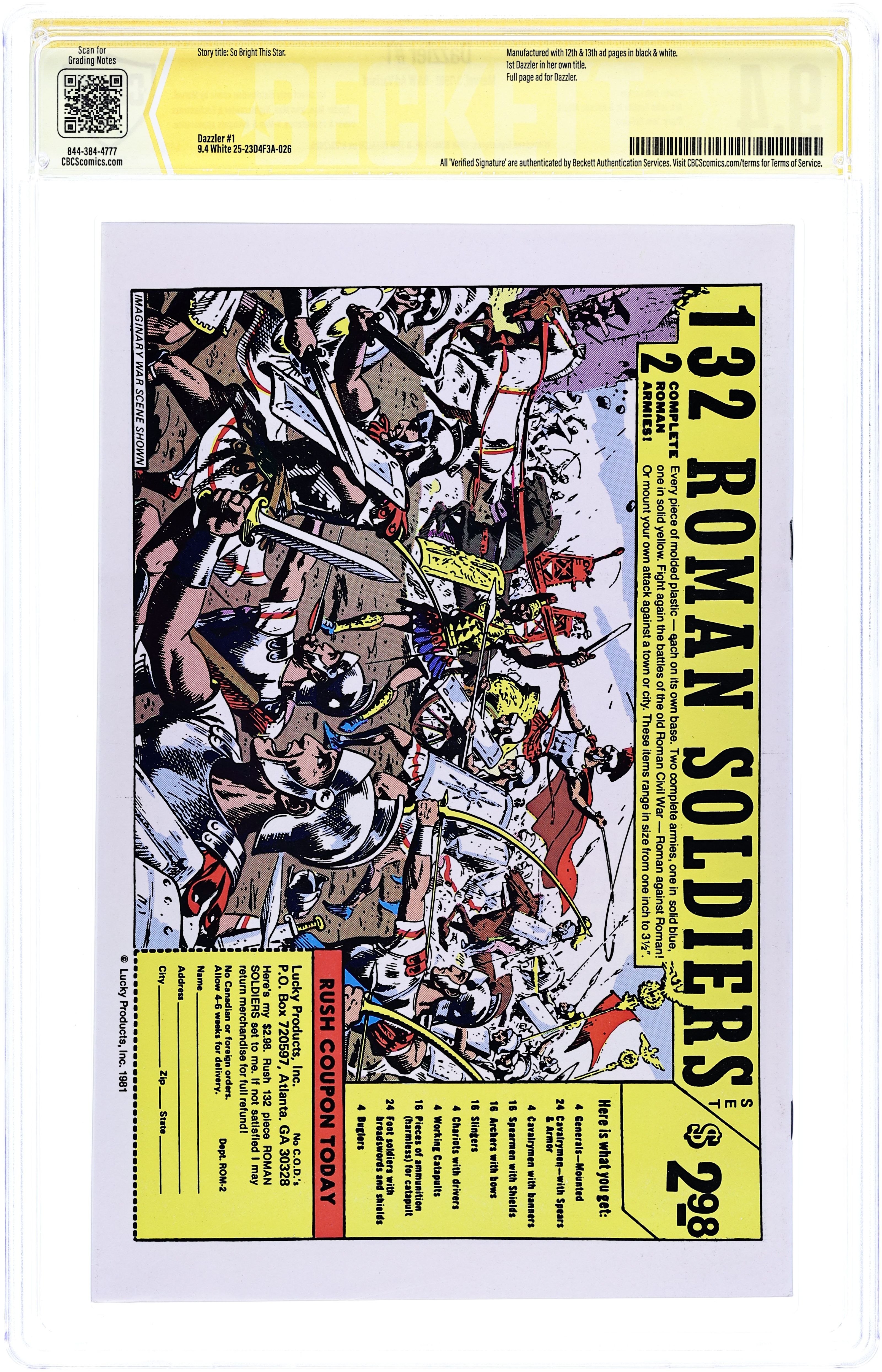 Error version with pages 24 & 25 printed in black and white. Dazzler origin in "So Bright This Star." Script by Tom DeFalco, pencils by John Romite Jr., inks by Alfredo Alcala. Guest appearances by Spider-Man, the X-Men (Storm, Wolverine, Colossus, Nightcrawler, and Sprite), the Avengers (Hawkeye, the Beast, Iron Man, the Wasp, and Captain America), and the Enchantress. This issue was not sold on newsstands, but available only from direst-sale outlets. Bob Larkin painted cover. Cover price $0.50.