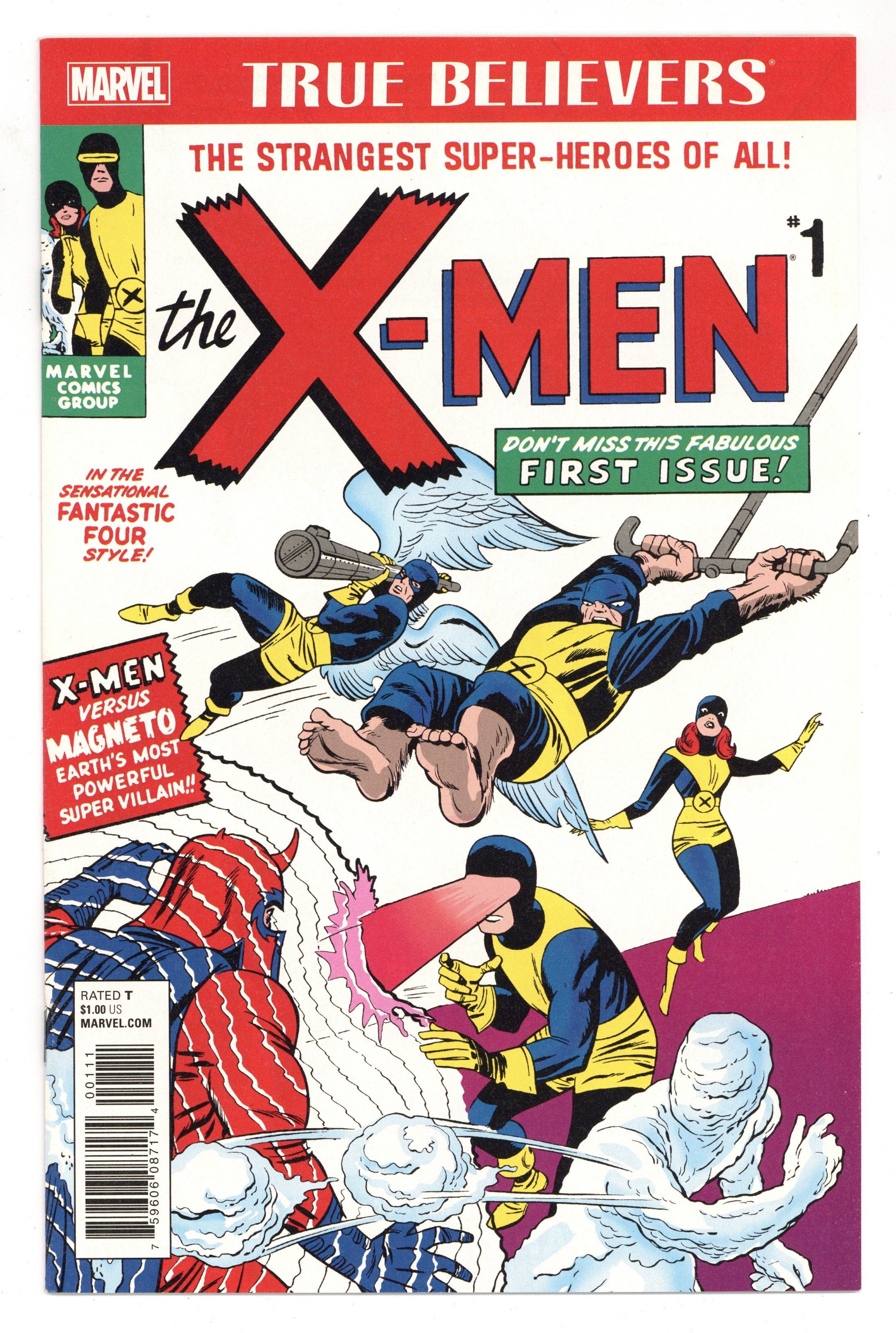 Written by Stan Lee. Art and Cover by Jack Kirby. Reprinting X-Men (1963) #1. After a day of training and meeting Jean Grey, a new student at Professor X's school, the X-Men go one their first assignment--stopping a mutant named Magneto from talking over an Air Force base. Full page house ads for Amazing Spider-Man #4 and Sgt. Fury and His Howling Commandos #3. This is it, the first issue of the Uncanny X-Men, and even in the beginning, there was Magneto, the Earth's most powerful super villain. Conceived by Stan Lee and Jack Kirby, this first issue will always remain one of the core books within the Marvel Comics mythos. This is Stan and Jack making history and legend, although no one knew it at the time. First appearances of Professor X, Cyclops, Iceman, the Angel, the Beast, Marvel Girl, and Magneto. 28 pages, full color. Rated T Cover price $1.00.
