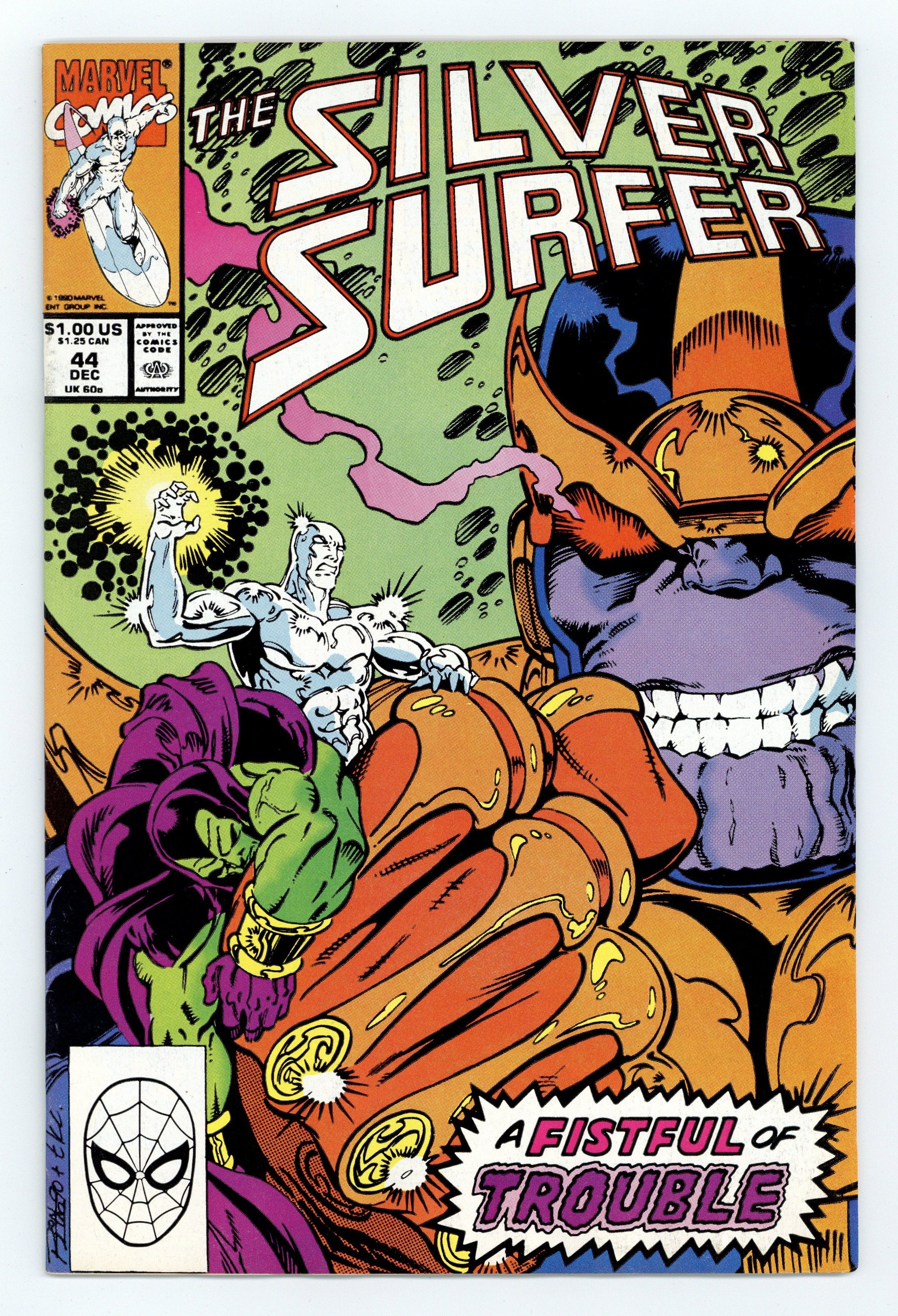 Direct Edition. Infinity Gauntlet: Prelude - "Epiphany!" Story by Jim Starlin. Art by Ron Lim and Tom Christopher. 1st appearance of the Infinity Gauntlet. Story continued from Thanos Quest (1990) #1-2. The Sentinel of the Spaceways and Drax the Destroyer combine their considerable might to battle Thanos. But the Mad Titan has acquired the Infinity Gems and now possesses nigh-omnipotent power. If they fail to defeat this despot, here and now, the universe is doomed! Cover price $1.00.