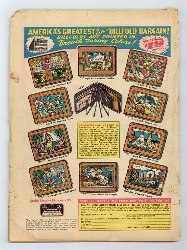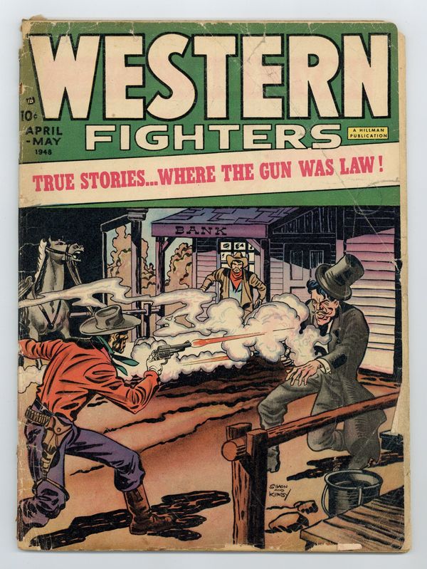 Cover pencils by Jack Kirby, inks by Joe Simon. "Black Bart," art by Dan Barry; The story of Black Bart, the terror and poet of the west; He robbed the rich to feed the poor, which hardly is a sin; And poems also did he write before he were put in. "Killers Die Too!", script by Dick Wood; The life and death of a notorious gunman called Ben Thompson, based on a true story. "Belle Starr"; A true story of the original gun girl of the west. "Bill Mayfield"; Bill Mayfield starts as a member of Henry Plummer's gang, and is later hanged in Idaho for more than five killings. ".45 Calibre Sneeze"; A gunman with an ugly sense of humor and entertainment, which ended when he was hung by an angry mob. "Vanishing Kid," pencils by Rudy Palais; An American badman goes to Canada where he commits murder, but are caught by the Mounted Police and hanged for his murders. Untitled one-page story; The guy is so big and tough that it hurts, but Tucson Tom can certainly do something about that. "Justice by Vigilante," art by Lee Elias; The vigilante committee thinks Sheriff Plummer is doing his best, but it's too big a job for one man; They begin their task, but find out the Sheriff himself is behind all the killings and robberies, so they hang him too. Untitled one-page story; Tom has a hard time getting to the cinema. 52 pgs., full color. Cover price $0.10.