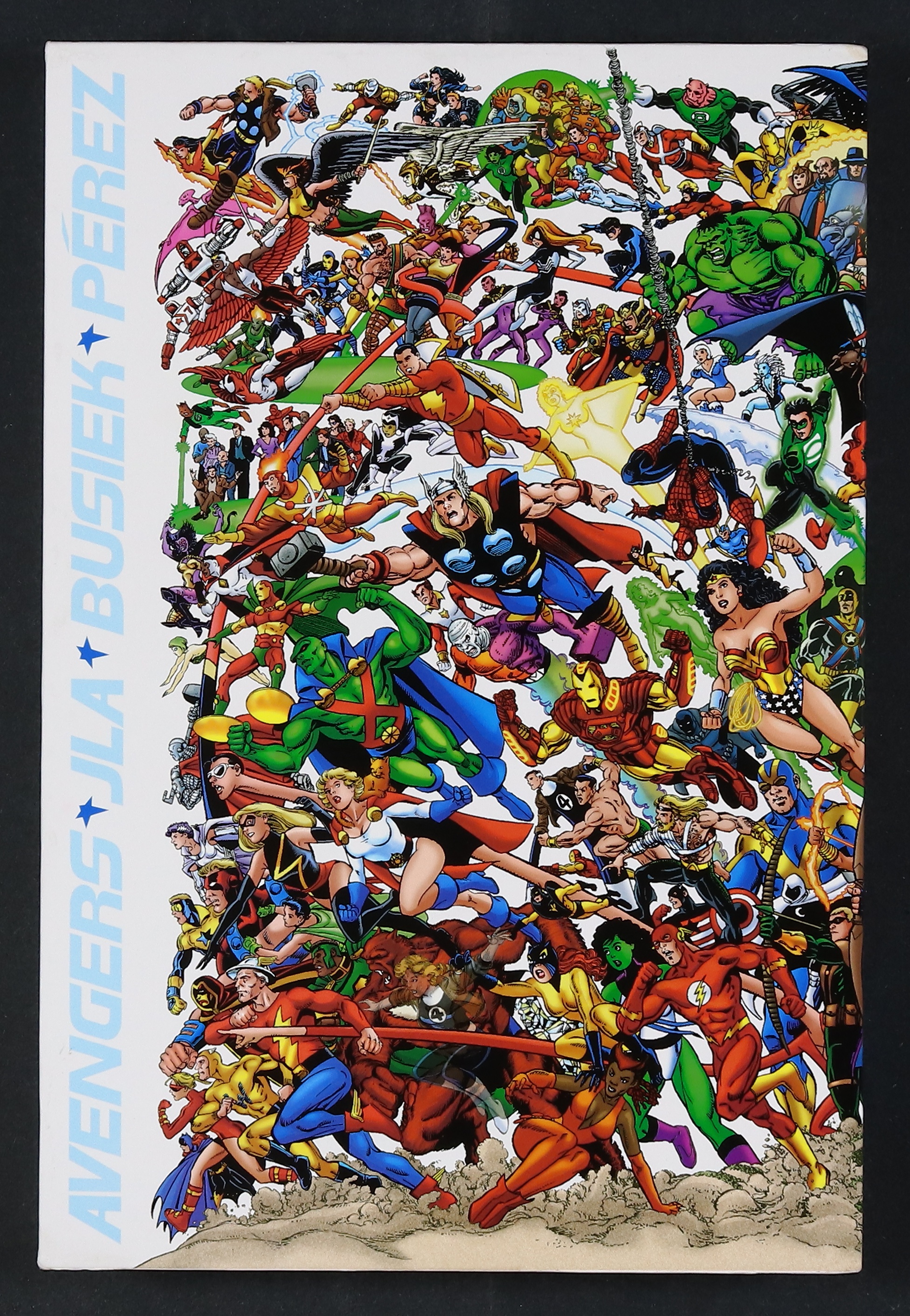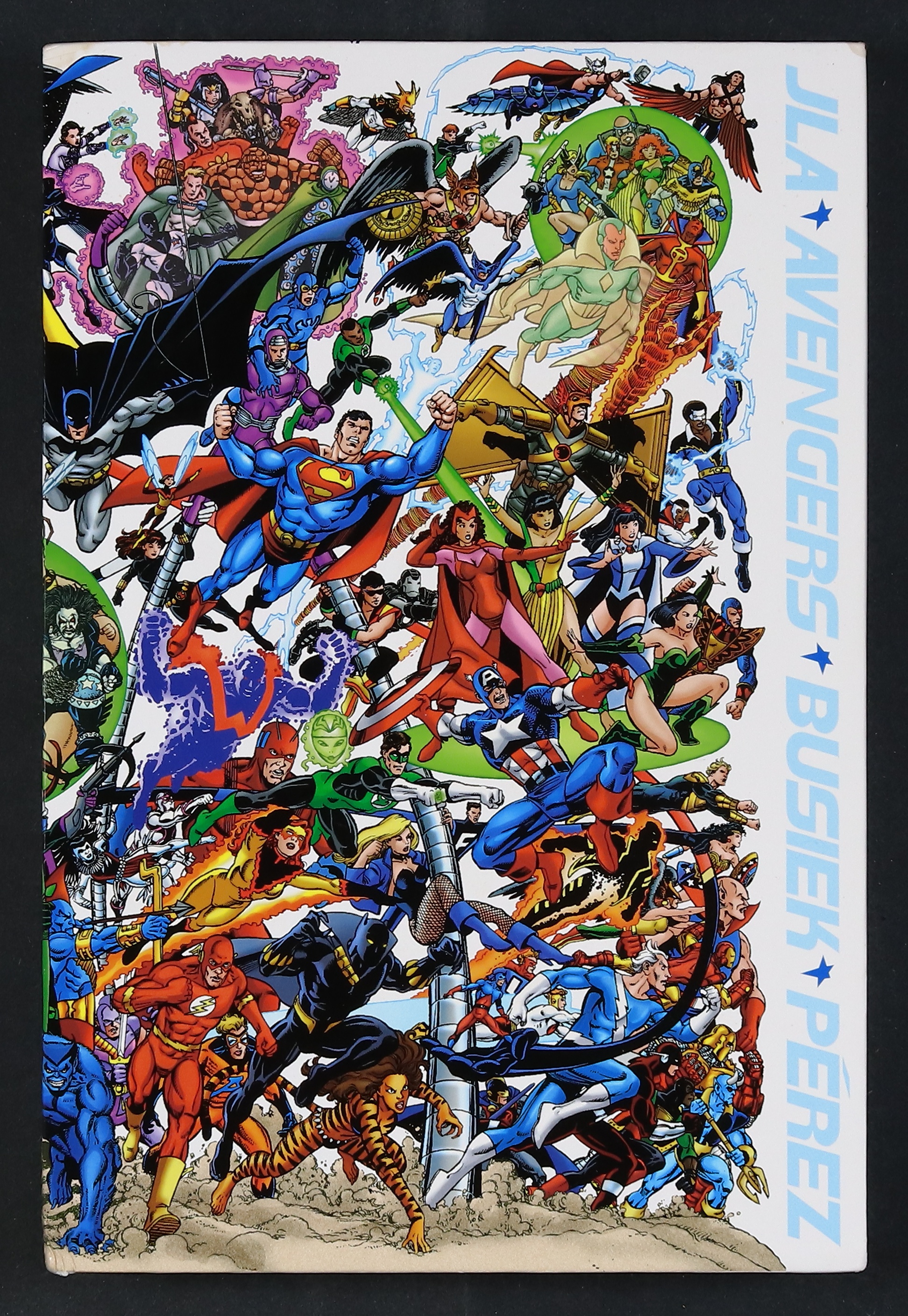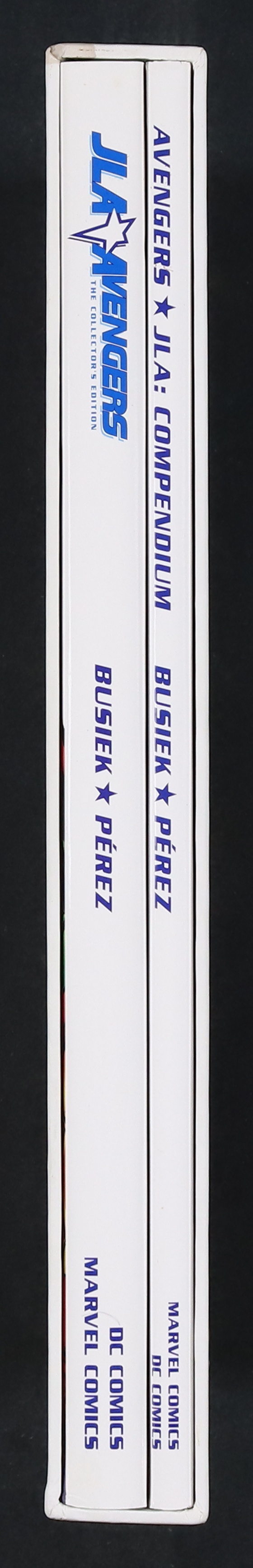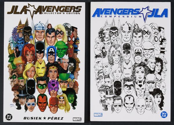 The landmark crossover event of the decade is collected in a spectacular 2-volume slipcased hardcover set! The first volume presents the 224-page, 4-issue miniseries, including introductions by Stan Lee and Julius Schwartz, and a key to the characters featured on the cover. The 64-page Compendium contains the original 21 pages of pencils from the previously unpublished 1980s crossover, an article on the original crossover by K.C. Carlson, the actual miniseries proposal and plot development, a Pérez portfolio of art done to commemorate the project, annotated notes from Kurt Busiek to the characters, and more. Includes tons of DVD style extras.