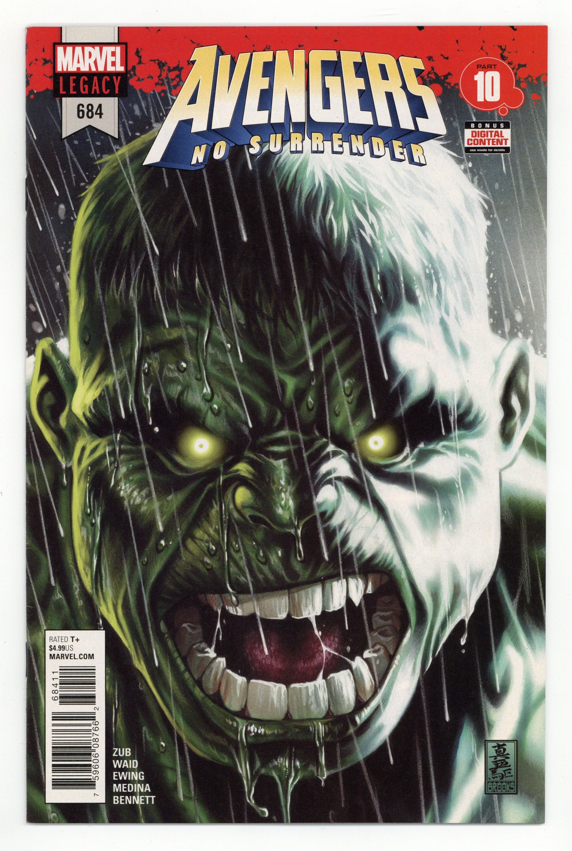 No Surrender: Part 10 of 16 - Written by Jim Zub, Mark Waid and Al Ewing. Art by Joe Bennett and Paco Medina. Cover by Mark Brooks. - THE AVENGERS WEEKLY EPIC CONTINUES IN THIS OVERSIZED ISSUE! Back from the dead! He cannot be reasoned with. He will not be stopped. Bruce Banner isn't home right now. There is only THE IMMORTAL HULK. 36 pages, full color. Rated T+