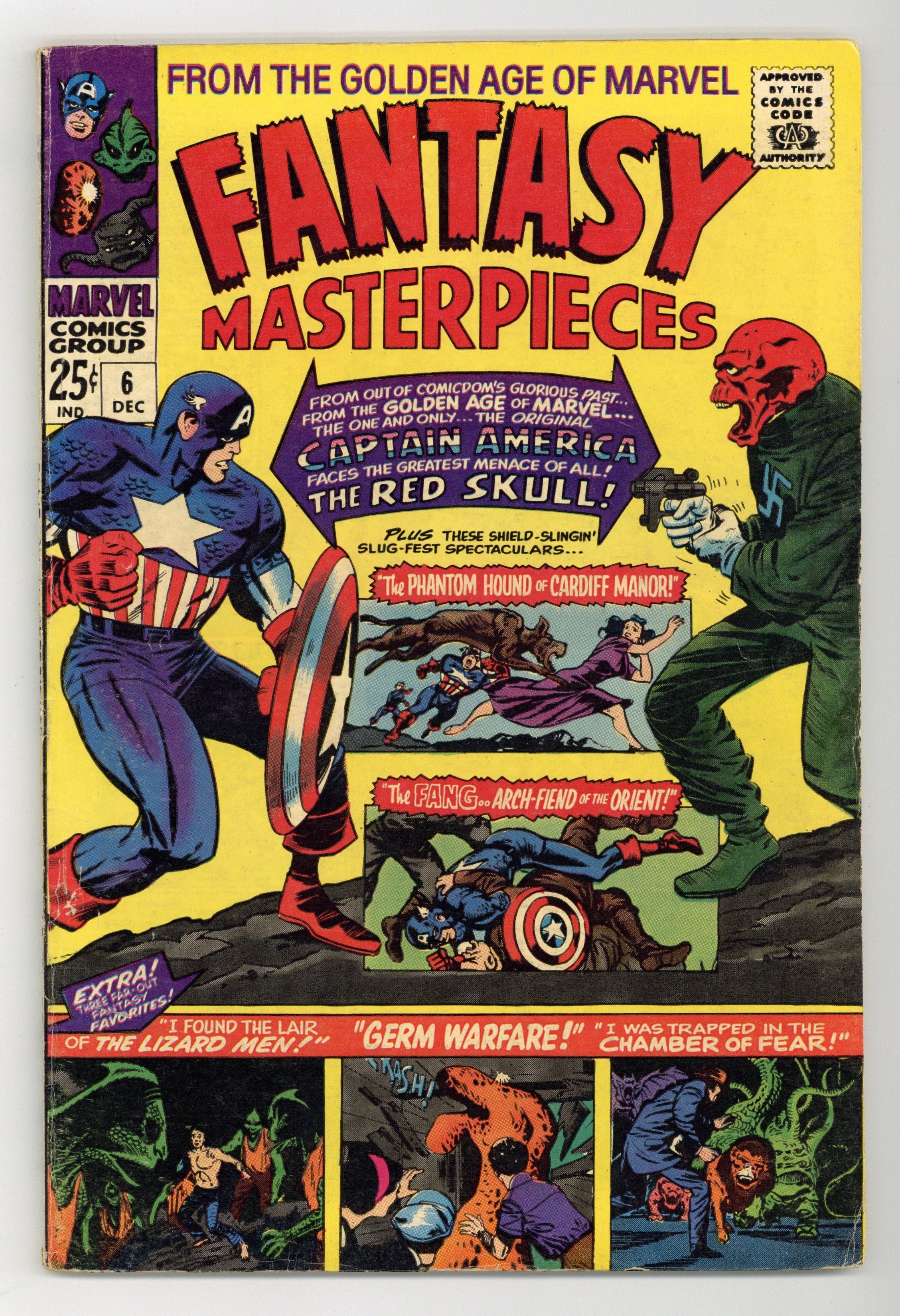 Cover pencils by Jack Kirby, Don Heck, and Paul Reinman (vignettes), inks by Vince Colletta, Don Heck, Paul Reinman, and Dick Ayers (vignettes). Reprints. "Captain America and the Red Skull" from Captain America Comics #7, script and pencils by Joe Simon and Jack Kirby, inks by Joe Simon; Cap has to contend with the return of the Red Skull and figure out why he is using Chopin's "Funeral March" as the means of his diabolical mission of destruction. "The Phantom Hound of Cardiff Moor" from Captain America Comics #10, , script and pencils by Joe Simon and Jack Kirby, inks by Joe Simon; Cap solves the mystery of Cardiff Manor and a "ghost" dog, used by the only living relative of the family that once owned the manor. "I Found the Lair of the Lizard Men" from Journey Into Mystery #64, art by Don Heck; A convict escapes and hides in a deep cave, where he finds a society of lizard men unable to breathe on the surface; When he tries to steal the diamond that provides their light he is transformed into a lizard man and forced to live among them as an outcast. "I Was Trapped In The Chamber Of Fear!" from Tales Of Suspense #33, pencils by Jack Kirby, inks by Dick Ayers; A man tries to pitch to Stan Lee the story of a blackmailer who becomes trapped within a mystic ruby as an agent of Fate to direct recently departed souls to their destination; Stan rejects the story as too outlandish even for Tales of Suspense and the man leaves the office. "Germ Warfare" from Strange Tales #90, art by Paul Reinman; A medical researcher working while on a boat with friends tries to enlarge a germ to more closely examine it, but it grows to human size and hijacks the boat; The doctor takes the germ to an island where it intends to enlarge an army of microbes to conquer the world. "Meet The Fang Arch Fiend Of The Orient from Captain America Comics #6, script and pencils by Joe Simon and Jack Kirby, inks by Joe Simon; Cap and Bucky battle against the evil Fang and Baron Nushima, who seek to prevent two emissaries from China from obtaining money loans from the American government. 68 pgs., full color. Cover price $0.25.