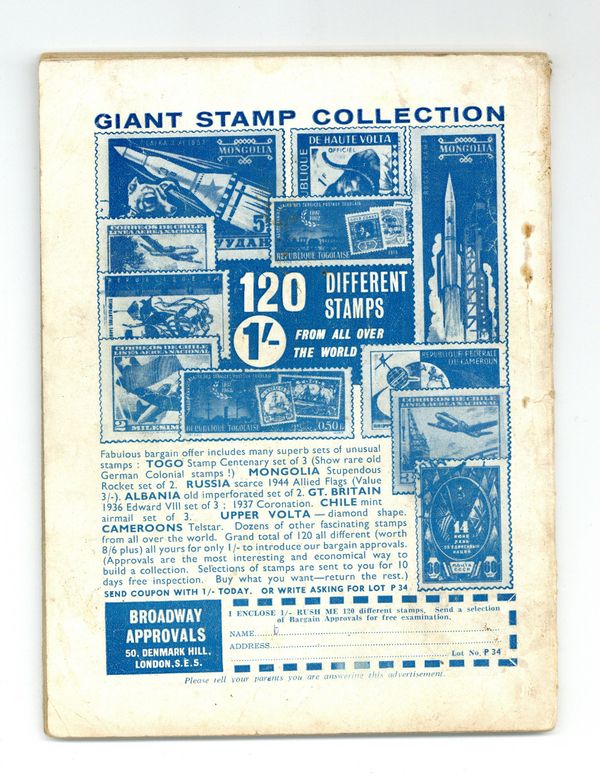 Published 1964 (est.) by IPC/Fleetway.$5.40- Front cover detached 10%. Back cover detached 10%. Water damage: Slight. Staple rust: Moderate.