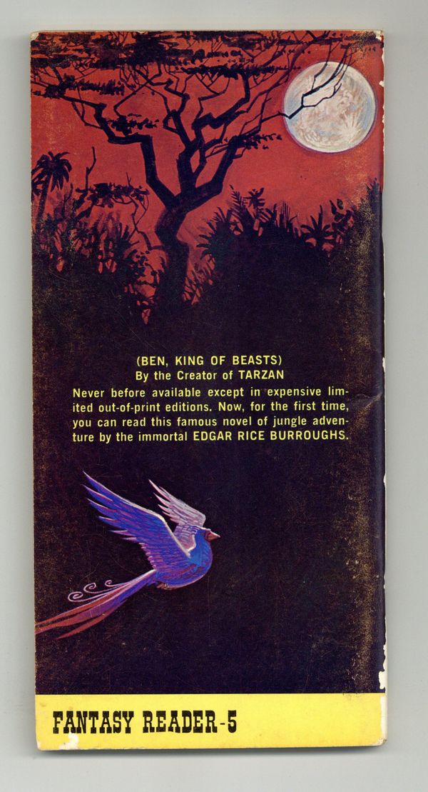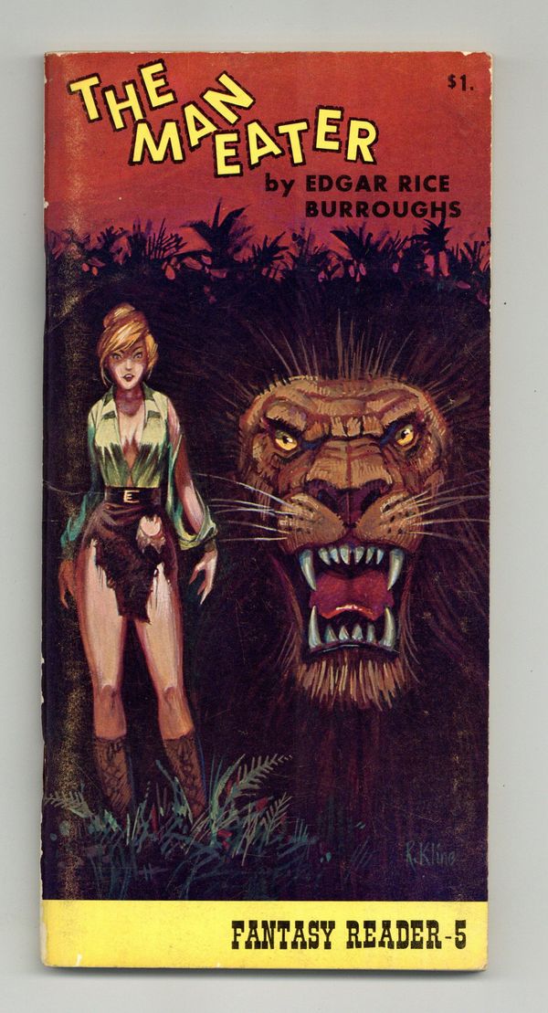 Published 1974 by Fantasy House.$8.40The Man Eater by Edgar Rice Burroughs. Cover by Robert Kline. Originally published in 1915, this novel should be placed between Tarzan of the Apes and The Beasts of Tarzan. Although not a Tarzan novel, the primary lion character bears a striking resemblance to Tarzan's golden lion and the locations are the same. 4-in x 8.25-in, 100 Pages, Text Only. Cover price $1.00.