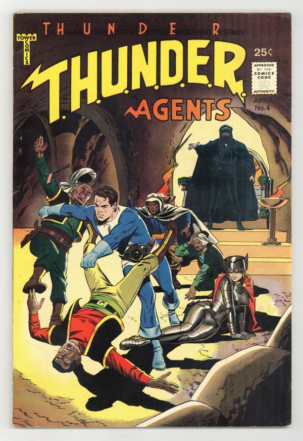 Published Apr 1966 by Tower Comics.$16.75Cover by Reed Crandall and Wally Wood. Stories and art by Wally Wood, Reed Crandall, Dan Adkins, Len Brown, Steve Skeates, John Giunta, Lou Silverstone, Frank Giacoia, Joe Giella and Mike Sekowsky. The cult-favorite super-team saga from Tower Comics features neat powers, bizarre villains, and great art by some comics legends. When Baron Von Kampf's Deadly Dust slows THUNDER to a crawl, the scientists respond with a super-speed suit, and the hero Lightning is born. A fight with mad scientist Dr. Sparta results in Dynamo battling a T-Rex on the streets of the city, in a story with great art by legendary artist Wally Wood. Android hero NoMan faces Mastermind, who employs his own army of androids. Master of Evolution; The Synthetic Stand-Ins; The Deadly Dust; The Return of the Iron Maiden; The Great Hypno. 64 pages, Full Color. Cover price $0.25.