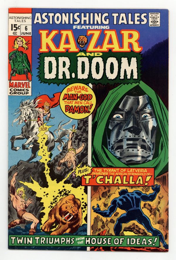 1st Appearance of Bobbi Morse (she later becomes Mockingbird) - Cover pencils by John Buscema, inks by Frank Giacoia. 'Ware the Winds of Death, script by Gerry Conway, pencils by Barry Windsor-Smith [as Barry Smith], inks by Bill Everett; Introduction of Damon the Man-God and his subsequent attack on the Savage Land; Also introduces Bobbi Morse and Tongah's sister and brother, Tatia and Emuel. Advertisement for posters of Fantastic Four, the Black Knight, Silver Surfer and Galactus, and Thor, with a subscription to Marvelmania also included. The Tentacles of the Tyrant!, script by Larry Lieber, pencils by George Tuska, inks by Mike Esposito; Dr. Doom travels to Wakanda to steal Vibranium. Stan Lee's Soapbox. 32 pgs. $0.15. Cover price $0.15.