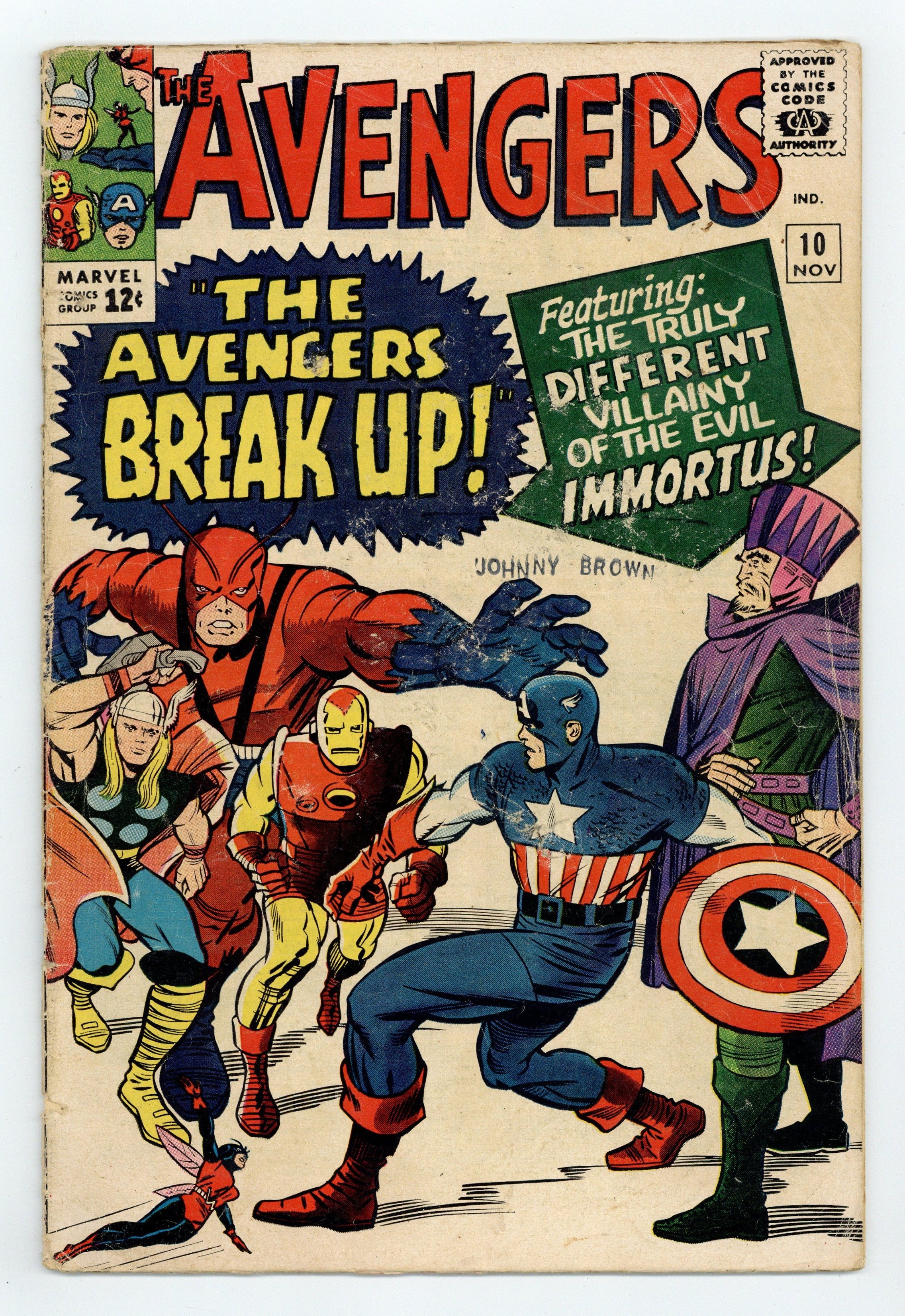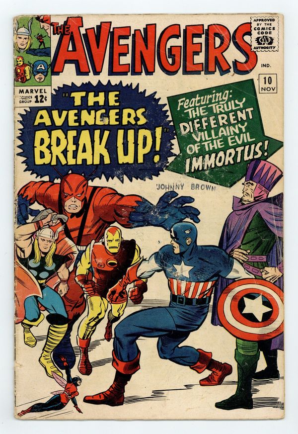 Cover pencils by Jack Kirby, inks by Chic Stone. First appearance of Immortus in "The Avengers Break Up!", script by Stan Lee, pencils by Don Heck, inks by Dick Ayers; Immortus appears before the Masters of Evil and demands to join them against the Avengers, using his control of the realm of Limbo to summon other powerful people from past ages to help them. Roster: Captain America, Thor, Iron Man, Wasp, Giant-Man, and Rick Jones. Villains: the Executioner, the Enchantress, Baron Zemo, and Kang. Letter to the editor from comics artist Gene Day. 36 pgs., full color. NOTE: The initial printing of Avengers #10 had an error where magenta was applied to the yellow color plate causing a miscoloring of the cover. Cover price $0.12.