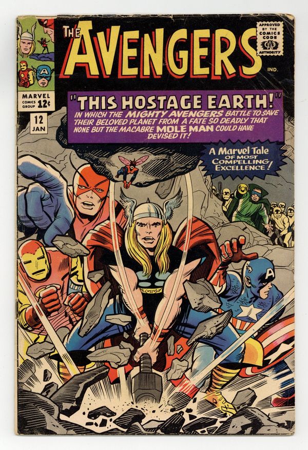 Cover pencils by Jack Kirby, inks by Chic Stone. "This Hostage Earth!", script by Stan Lee, pencils by Don Heck, inks by Dick Ayers; Ants warn Giant Man that there is something wrong, but none of the other Avengers believe him; In truth, it is the Mole Man, who plans to destroy the surface world by making the Earth spin very fast on its axis; And now, with his new ally the Red Ghost, how can he be stopped? Avengers Roll Call: Captain America, Thor, Iron Man, Giant Man, Wasp, and Rick Jones. Villains: the Red Ghost, the Mole Man, and the first appearance of Monk Keefer. Flashback cameos by Mr. Fantastic, Invisible Girl, and Human Torch (of the Fantastic Four). Letters to the editor from science fiction writer George R.R. Martin and Steve Erickson (the writer?). Reprinted in Marvel Triple Action # 6. 36 pgs., full color. $0.12. Cover price $0.12.