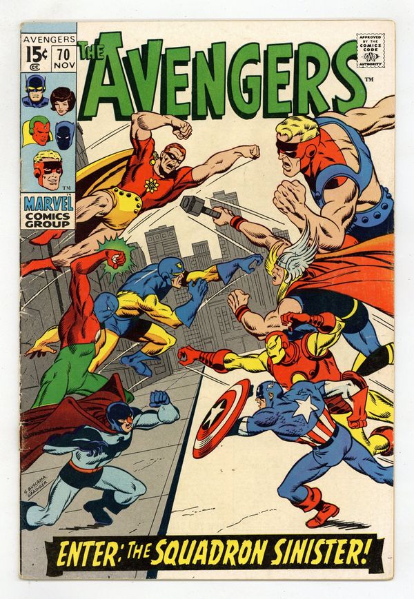 "When Strikes the Squadron Sinister!" Part 2 of 3. Script by Roy Thomas. Pencils by Sal Buscema. Inks by Sam Grainger. Cover by Sal Buscema and Sam Grainger. The galactic game between Kang and the Grandmaster begins! And the opening round pits Earth's Mightiest Heroes vs. the Squadron Sinister! Captain America vs. Nighthawk on Liberty Island! Iron Man vs. Doctor Spectrum at the Taj Mahal! Thor vs. Hyperion in Egypt! And Goliath vs. the Whizzer in London! The Avengers need four victories to win the first round for Kang! The Conqueror's team appears on track for a worldwide sweep until the Black Knight unwittingly interferes with Goliath's duel at the Big Ben Clock Tower! The Grandmaster is furious about the knight's interference! Have Dane Whitman's good intentions accidentally doomed the Earth to destruction? First full appearance of the Squadron Sinister (and Kyle Richmond aka Nighthawk). Avengers Lineup: Black Panther, Black Knight, Captain America, Goliath, Hawkeye, Iron Man, Thor, Vision, Yellowjacket, and the Wasp. (Notes: The Squadron Sinister returns in Defenders 13. Shell-Head and Dr. Spectrum battle again in Iron Man 63. Nighthawk appears next in Daredevil 62.) 36 pages. Cover price $0.15.