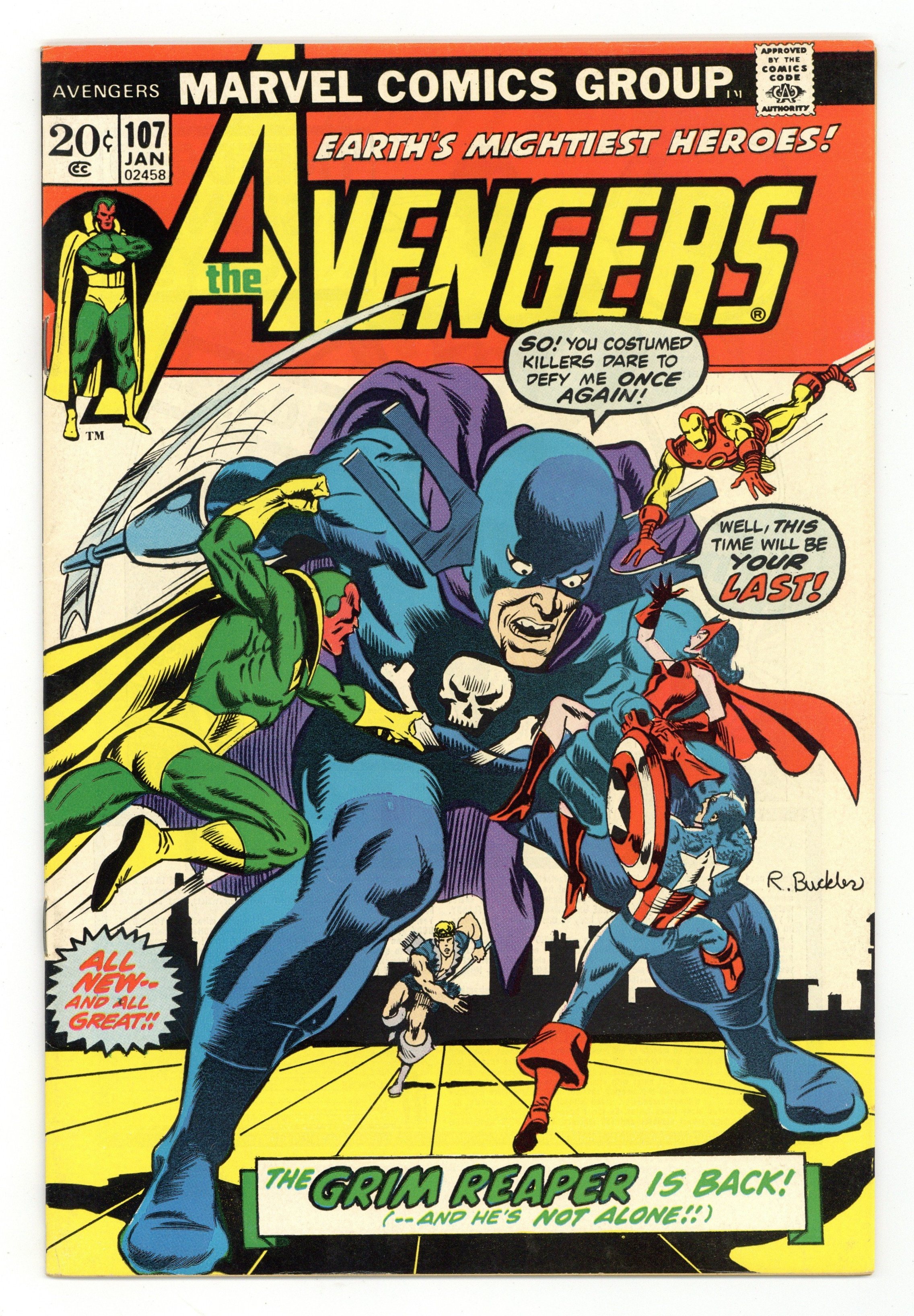 "The Master Plan of the Space Phantom!" Part 2 of 3. Script by Steve Englehart. Pencils by Jim Starlin (pages 1-3, 13-20) and George Tuska (pages 4-13) Inks by Dave Cockrum. Cover by Rich Buckler. The Space Phantom is back! And the Grim Reaper is right by his side! Four avengers have already fallen to the deadly duo and now only Captain America and the Vision remain free! The star-spangled avenger visits an old Hydra hideout to solve the mystery of his sudden flashbacks, while the synthezoid avenger wanders through Central Park. When the Grim Reaper catches up to the Vision, he makes him a final, yet different offer: Forget the body of Simon Williams, take the body of Captain America instead! Wow, would the Vision agree to that? Stay tuned! Flashback cameos by the original Avengers, Loki, Jane Foster, Rick Jones, and Madame Hydra to recap the events of Avengers (1st series) 2, Thor 108, and Captain America 113, respectively. Avengers Lineup: Black Panther, Captain America, Hawkeye, Iron Man, Scarlet Witch, and the Vision. (Note: The letters page includes a letter from Elfquest creator Wendy Pini.) 36 pages Cover price $0.20.