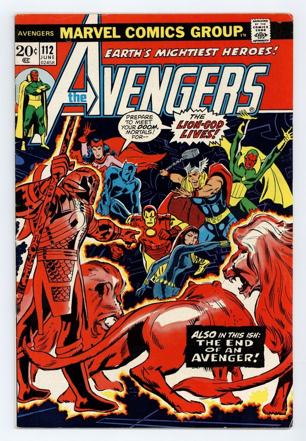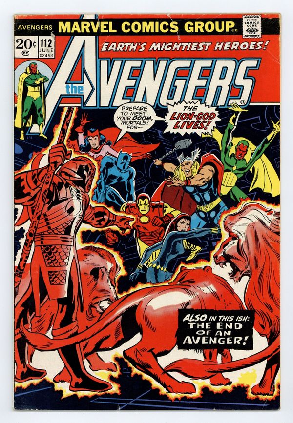 Tags: Marvel Legacy Numbering: Avengers (part 112), Avengers$39.00"The Lion God Lives!" First appearance of Mantis. Script by Steve Englehart. Pencils by Don Heck. Inks by Frank Rolle. Cover by Don Heck. A mob of African protesters gathers outside Avengers Mansion and demands that the Black Panther return to his native Wakanda! When T'Challa goes outside to talk, he's kidnapped by their leader, the Lion God! Then the mob disperses and the Avengers are left wondering what just happened! However several hours later, the Lion God returns to the mansion and the no-holds-barred battle begins! Unfortunately, Earth's Mightiest Heroes fall one-by-one until only the Avengers' resident god remains! Can the Mighty Thor bring down the thunder and lightning and silence the Lion God's roar? Meanwhile on the other side of the globe, a mysterious couple makes plans to travel to the United States and join the Avengers. Cameo appearances by Mantis and the Swordsman. Avengers Lineup: Black Panther, Black Widow, Captain America, Iron Man, Scarlet Witch, Thor, and the Vision. 36 pages Cover price $0.20.