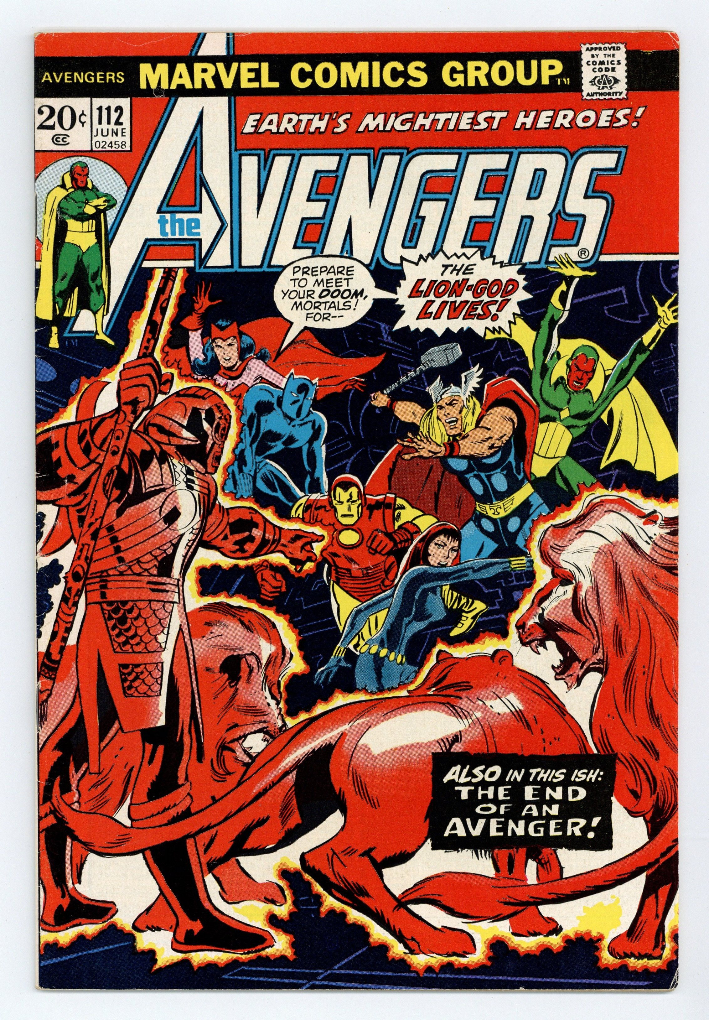 "The Lion God Lives!" First appearance of Mantis. Script by Steve Englehart. Pencils by Don Heck. Inks by Frank Rolle. Cover by Don Heck. A mob of African protesters gathers outside Avengers Mansion and demands that the Black Panther return to his native Wakanda! When T'Challa goes outside to talk, he's kidnapped by their leader, the Lion God! Then the mob disperses and the Avengers are left wondering what just happened! However several hours later, the Lion God returns to the mansion and the no-holds-barred battle begins! Unfortunately, Earth's Mightiest Heroes fall one-by-one until only the Avengers' resident god remains! Can the Mighty Thor bring down the thunder and lightning and silence the Lion God's roar? Meanwhile on the other side of the globe, a mysterious couple makes plans to travel to the United States and join the Avengers. Cameo appearances by Mantis and the Swordsman. Avengers Lineup: Black Panther, Black Widow, Captain America, Iron Man, Scarlet Witch, Thor, and the Vision. 36 pages Cover price $0.20.