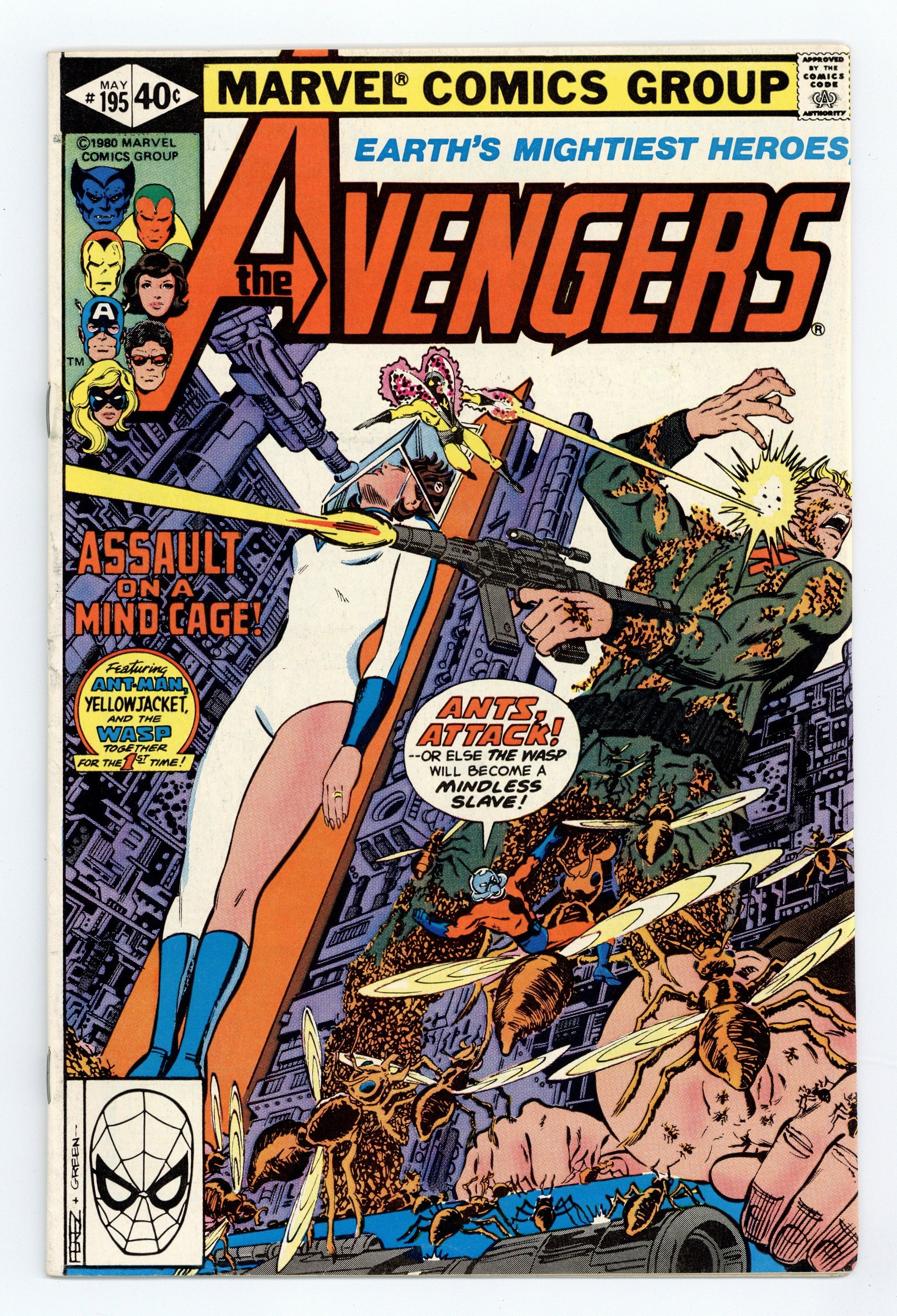 Tags: Marvel Legacy Numbering: Avengers (part 195), Avengers$14.25Direct Edition. "Assault on a Mind Cage!" Guest-starring Ant-Man. Script by David Michelinie. Pencils by George Perez. Inks by Jack Abel and Dan Green. Cover by George Perez and Dan Green. The Wasp has taken it upon herself to invade the Solomon Institute and find out what's going on inside! Unfortunately though, it's been several hours since anyone's heard from her! So Yellowjacket and Ant-Man (aka Scott Lang) infiltrate the institute, while the remaining avengers wait outside in the snow! The three insect-size heroes are having an easy time defeating all the guards in the asylum, but their fortunes dramatically change when the institute's head honcho arrives...the Taskmaster! First (cameo) appearance of the Taskmaster. Avengers Lineup: Beast, Captain America, Iron Man, Jocasta, Ms. Marvel, Vision, Wasp, Wonder Man, and Yellowjacket. 36 pages Cover price $0.40.