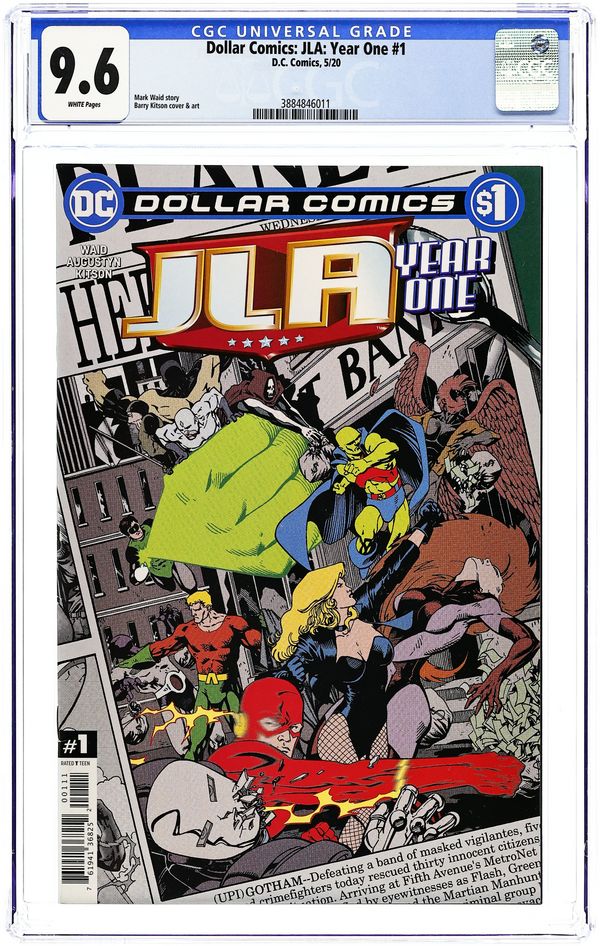 Reprinting JLA Year One (1998) #1. Written by Mark Waid and Brian Augustyn. Art and Cover by Barry Kitson. In the wake of an epic battle, a super team is born! Offered to coincide with Justice League of America A Celebration of 60 Years HC (2020 DC) #1. After individually defeating a different alien threat, known collectively as the Appellax, Martian Manhunter, Green Lantern (Hal Jordan), Flash (Barry Allen), Black Canary (Dinah Lance), and Aquaman each consider the potentials of forming and working as a team. While meeting to confront the final Appellax, Black Canary teaches Barry some techniques from the Golden Age Flash, while Green Lantern, Martian Manhunter, and Aquaman realize the power of their combined strength and ability to compensate for each other's weakness. Meanwhile Locus, the militarized group connected to the Appellax, also realizes the ramifications of facing a unified team of heroes. *Note: JLA Year One expands upon the post-Crisis origin of the Justice League established in Secret Origins (1986-1990 2nd Series) #32. Due to post-Crisis continuity changes that excluded Wonder Woman from being a founding member, Black Canary became the original female member of the team. 48 pages, full color. Rated T Cover price $1.00.