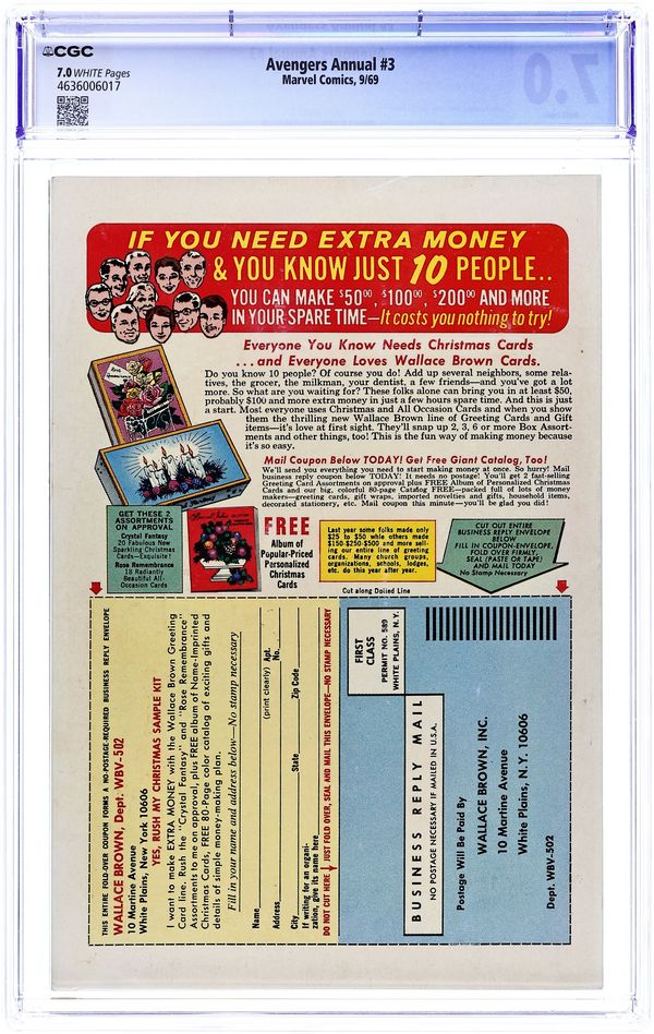 Tags: Avengers$75.00This annual features four reprint stories and a new cover by John Buscema and Frank Giacoia. First story reprinted from Avengers (1st series) 4: "Captain America Joins the Avengers!" Script by Stan Lee. Pencils by Jack Kirby. Inks by George Roussos. The first silver age appearance of Captain America! With inadvertent aid from the Sub-Mariner, the Avengers find the frozen body of Captain America drifting aimlessly in the North Sea! And at that very moment...the legend of the star-spangled avenger is born! Second story reprinted from Tales of Suspense 66: "The Fantastic Origin of the Red Skull" Script by Stan Lee. Pencils by Jack Kirby. Inks by Chic Stone. The Red Skull tells his origin to his star-spangled prisoner, Captain America. Third story reprinted from Tales of Suspense 67: "Lest Tyranny Triumph!" Script by Stan Lee. Pencils by Jack Kirby. Inks by Frank Ray (aka Frank Giacoia). Under the mental control of the skull, Captain America invades the Allied Headquarters in London! But his loyal partner, Bucky, will try to stop him from accidentally shooting the Allied Supreme Commander! Fourth story reprinted from Tales of Suspense 68: "The Sentinel and the Spy!" Script by Stan Lee. Pencils by Jack Kirby. Inks by Frank Ray. The shield-slinger and Bucky foil the Red Skull's plans...not once but twice! 68 pgs. Cover price $0.25.
