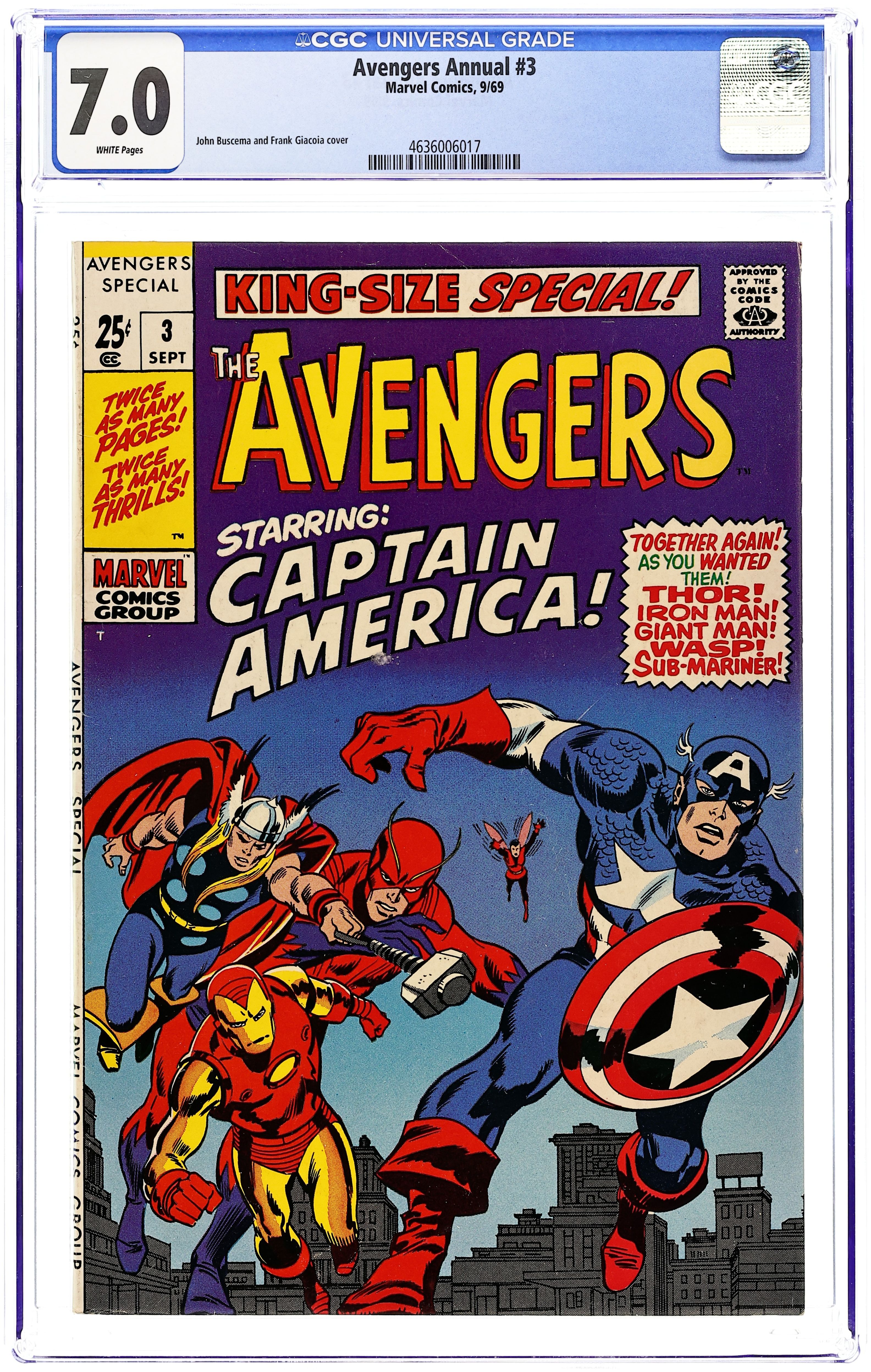 This annual features four reprint stories and a new cover by John Buscema and Frank Giacoia. First story reprinted from Avengers (1st series) 4: "Captain America Joins the Avengers!" Script by Stan Lee. Pencils by Jack Kirby. Inks by George Roussos. The first silver age appearance of Captain America! With inadvertent aid from the Sub-Mariner, the Avengers find the frozen body of Captain America drifting aimlessly in the North Sea! And at that very moment...the legend of the star-spangled avenger is born! Second story reprinted from Tales of Suspense 66: "The Fantastic Origin of the Red Skull" Script by Stan Lee. Pencils by Jack Kirby. Inks by Chic Stone. The Red Skull tells his origin to his star-spangled prisoner, Captain America. Third story reprinted from Tales of Suspense 67: "Lest Tyranny Triumph!" Script by Stan Lee. Pencils by Jack Kirby. Inks by Frank Ray (aka Frank Giacoia). Under the mental control of the skull, Captain America invades the Allied Headquarters in London! But his loyal partner, Bucky, will try to stop him from accidentally shooting the Allied Supreme Commander! Fourth story reprinted from Tales of Suspense 68: "The Sentinel and the Spy!" Script by Stan Lee. Pencils by Jack Kirby. Inks by Frank Ray. The shield-slinger and Bucky foil the Red Skull's plans...not once but twice! 68 pgs. Cover price $0.25.