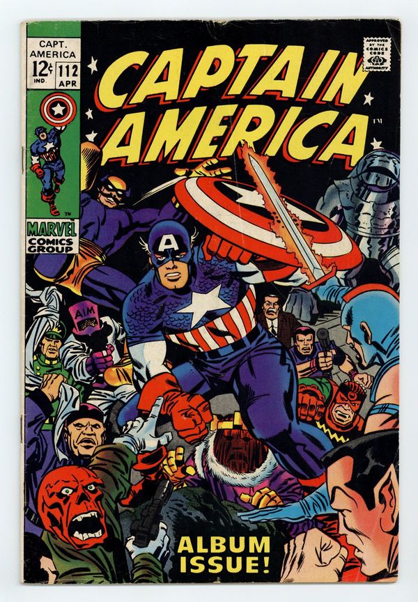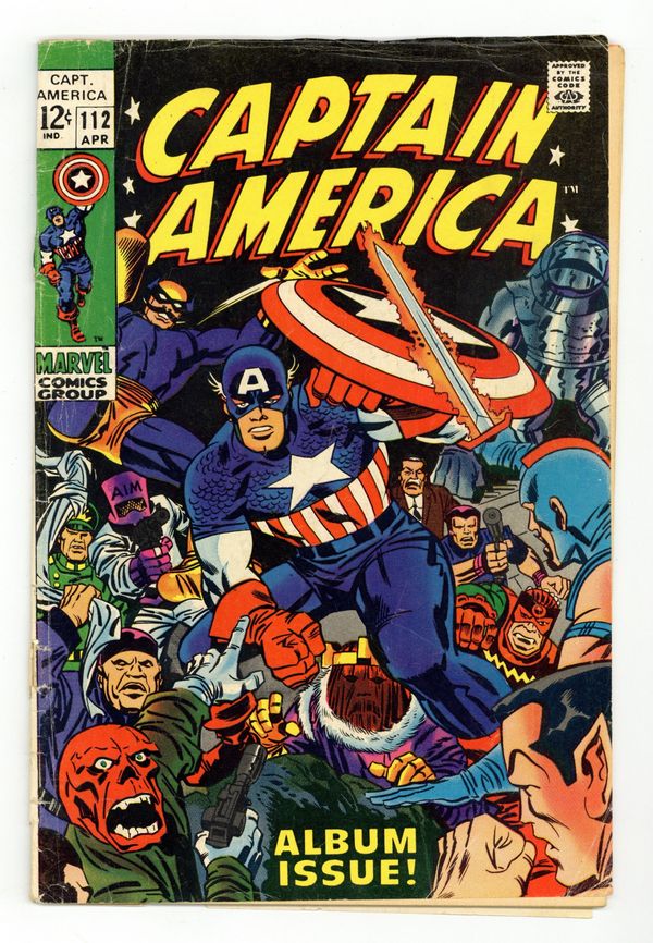 Tags: Marvel Legacy Numbering: Captain America (part 112), Captain America$31.00Cover pencils by Jack Kirby, inks by Frank Giacoia. "Lest We Forget!", script by Stan Lee, pencils by Jack Kirby (Jack did the art for this issue in a single 24 hour marathon!), inks by George Tuska; After Hydra attacks at a carnival, Captain Americas uniform, riddled with bullets, convinces everyone that Cap is dead; At Avengers Mansion, Iron Man prepares a statement saying Cap is dead; Reminiscing on Captain America's heroic feats during World War II, Iron Man recalls how Cap and Bucky battles the Red Skull, including a story in which Cap and Bucky ruined the Red Skulls plot to use a giant power drill; He also recalls Cap clashes with such villains as the Butterfly, the original Circus of Crime, the Unholy Legion of Beggars, White Death, the Toadman, and Baron Zemo; Cameo by Red Skull imposter George Maxon; Tony Stark (Iron Man) narrates this story. 36 pgs., full color. $0.12. Cover price $0.12.