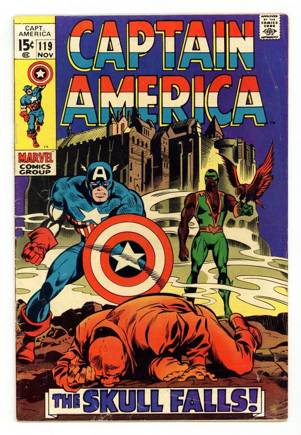 Tags: Marvel Legacy Numbering: Captain America (part 119), Captain America$24.00Cover pencils by Gene Colan, inks by Joe Sinnott. The dramatic conclusion to the story that began back in issue 115 in "Now Falls the Skull!", script by Stan Lee, pencils by Gene Colan, inks by Joe Sinnott; The Red Skull uses the Cosmic Cube to change bodies back with Captain America; Falcon realizes the man who he has been working with is Captain America; The Skull uses the Cube to toy with Cap and the Falcon during their battle; Elsewhere, MODOK activates his newly-created Catholite Block to disrupt the power of the Cosmic Cube; The Red Skull uses the remaining power of the Cube to disappear. Letter to the editor from writer Alan Brennert. 36 pgs., full color. $0.15. Cover price $0.15.