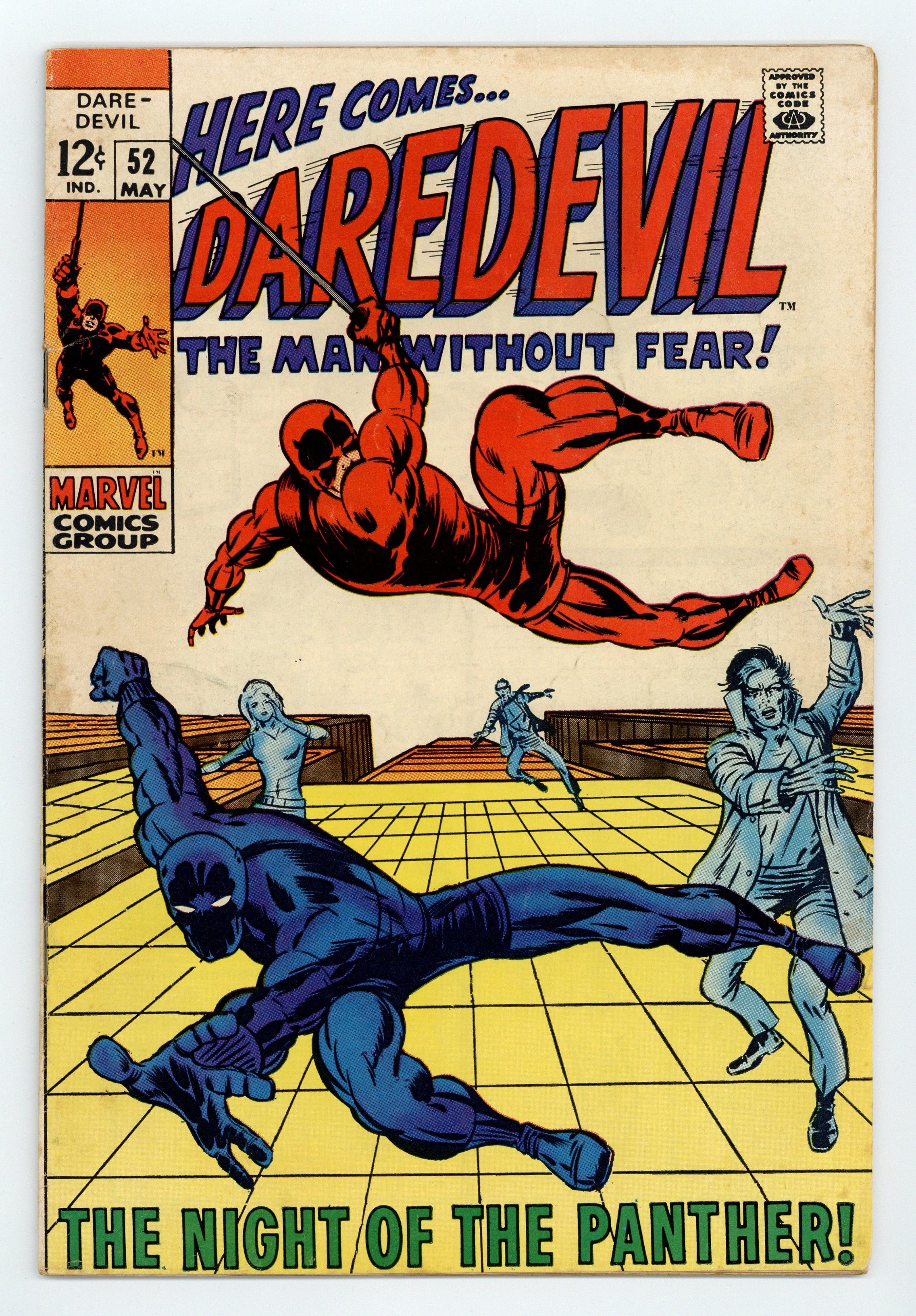 Cover pencils by Barry Windsor-Smith, inks by Johnny Craig. The Night of the Panther, script by Roy Thomas, pencils by Barry Windsor-Smith [as Barry Smith], inks by Johnny Craig; DD is dying of radiation poisoning and Black Panther helps him rescue Karen from Saxon; Both the Panther and Saxon know DD's secret identity; appearances by the Vision and Yellowjacket. 36 pgs. Cover price $0.12. Cover price $0.12.