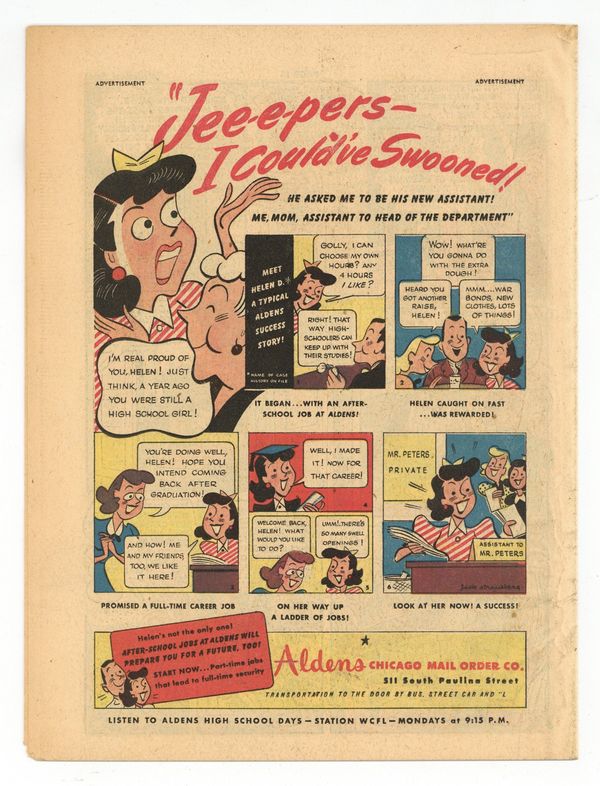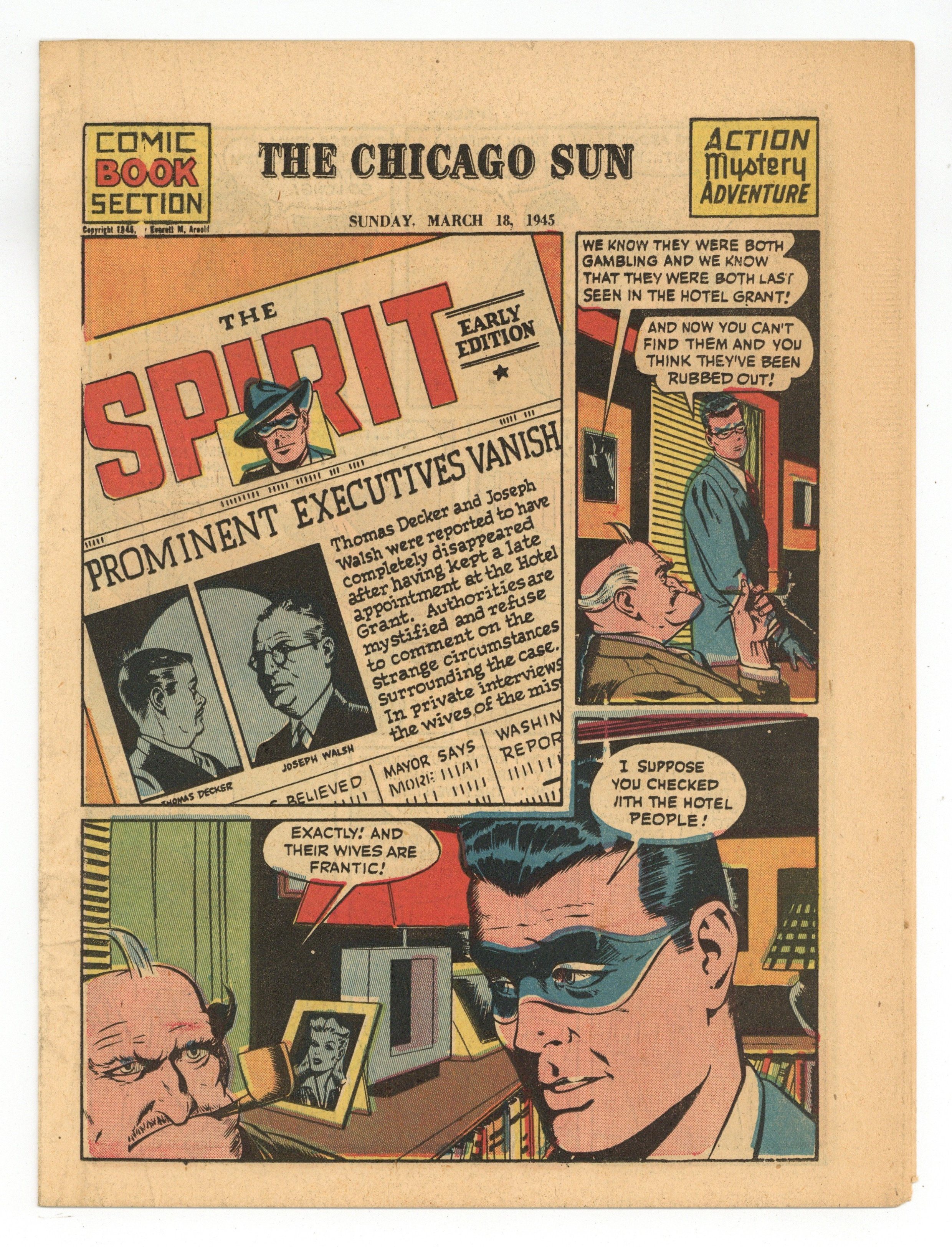 Published Mar 1945 by Promotional.$76.00Spirit Weekly Newspaper Comic Insert. 7-1/2 x 10 inches, 16 pages, full color, all newsprint with no slick cover. Wellman/Woolfolk scripts, Fine art with unknown staff assists.