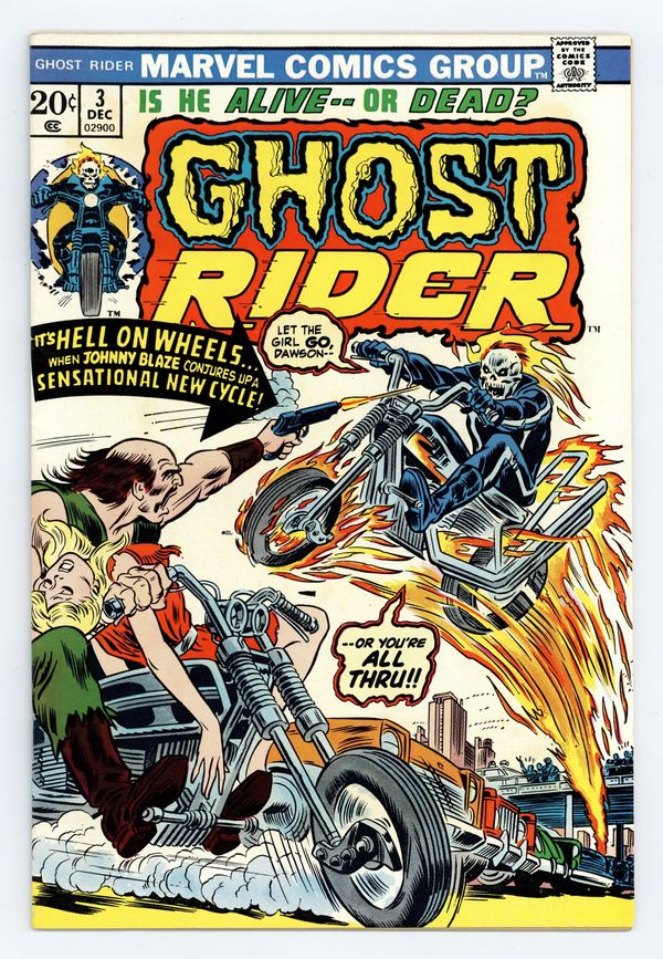 "Wheels on Fire!" Guest-starring Daimon Hellstrom (Son of Satan). Story by Gary Friedrich. Art by Jim Mooney and John Tartaglione. Cover by John Romita, Sr. It had to happen, the fateful final showdown with Big Daddy Dawson! Plus, in this issue, Ghost Rider learns how to summon forth his mystical motorcycle! 32 pages, FC. Cover price $0.20.