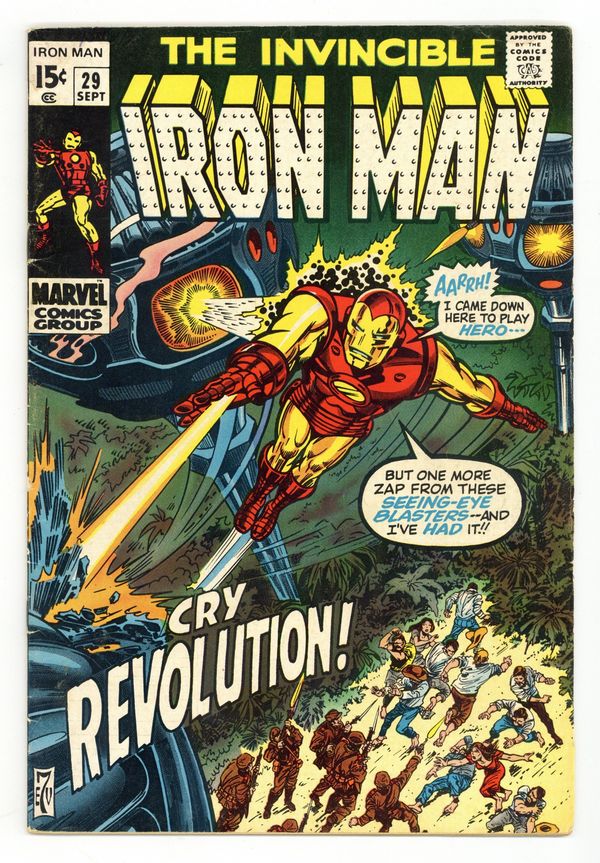 "Save the People ? Save the Country!" Story by Mimi Gold. Art by Don Heck and Chic Stone. Cover by Marie Severin and Bill Everett. Tony Stark is on vacation in the Caribbean when he suddenly encounters political refugees from a nearby island. A tyrant called the Overseer has taken over the small island nation. Now Tony has a decision to make: is the golden avenger going to become a freedom fighter? 32 pages Cover price $0.15.