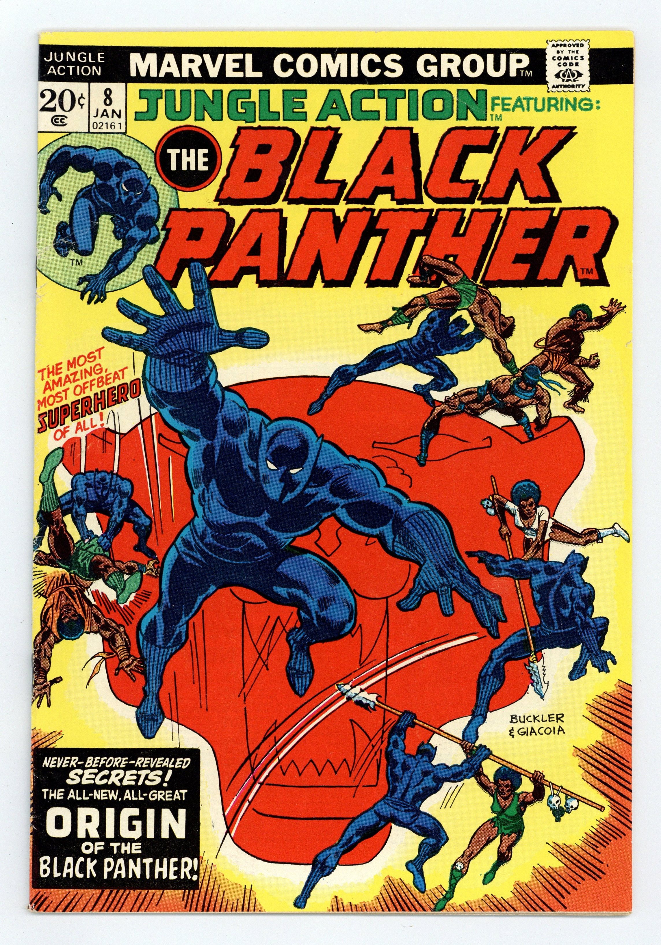 Tags: Black Panther$19.00Last 20-cent cover price. Cover pencils by Rich Buckler, inks by Frank Giacoia. The Black Panther stars in Panther's Rage part 3, "Malice by Crimson Moonlight," script by Don McGregor, pencils by Rich Buckler, inks by Klaus Janson; Malice attacks the palace in an effort to free Venomm; featuring Erik Killmonger, Mendinao (introduction), Kradada (introduction), Black Panther, Zatama, W'kabi, Taku, and Monica Lynn. Four-page back-up feature, "Black Panther Artistry," reprints previous art of the character, including panels by John Buscema/George Klein, Barry Windsor-Smith/Johnny Craig, Jack Kirby/Joe Sinnott, Herb Trimpe, and Buckler/Janson. Ad for The Ultimate Fan Club! FOOM! Friends Of Ol' Marvel. Map of the Land of Wakanda by Don McGregor. Central Wakanda's Palace Royal illustration. 36 pgs., full color. Cover price $0.20.