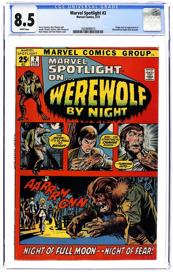 52-page giant. Origin and first appearance of Werewolf By Night. Cover pencils by Neal Adams, inks by Tom Palmer. First Night, script by Roy Thomas (plot); Jean Thomas (plot), and Gerry Conway (script), art by Mike Ploog; Jack learns of the family curse on his eighteenth birthday from his mother on her deathbead; Jack begins to believe that his step-father had his mother killed. House ad for Venus, art by Bill Everett. Where Gargoyles Dwell! starring Venus, script and art by Bill Everett. 52 pages, full color. Cover price $0.25.