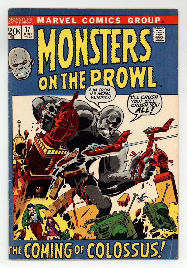 $18.00Cover art by Herb Trimpe. Chapter One I Created the Colossus!, pencils by Jack Kirby, inks by Dick Ayers; Boris Petrovski is suspected of democratic tendencies so his brother Ivan demands that he build the largest, strongest, most impressive statue in the world as a symbol of the power and invincibility of their government. Chapter Two "The Colossus Lives!", pencils by Jack Kirby, inks by Dick Ayers; The Colossus escapes from the army and Boris takes the opportunity to attack the regime by declaring that after he built the statue a voice came from the beyond saying that it was time for dictators to be brought to task and power-mad rulers to be halted. Chapter Three "The Power of the Colossus!", plot by Stan Lee, pencils by Jack Kirby, inks by Dick Ayers; The Colossus flies and manages to destroy the plane with the hydrogen bomb; It then lands and another spaceship appears; The crab-like creature leaves the Colossus and goes home. Island of Fear!, art by Joe Sinnott; A "ghoulish" reporter finds more than he bargained for when he meets with a mysterious stranger on a boat to talk about some local disappearances. 36 pgs. $0.20. Cover price $0.20.