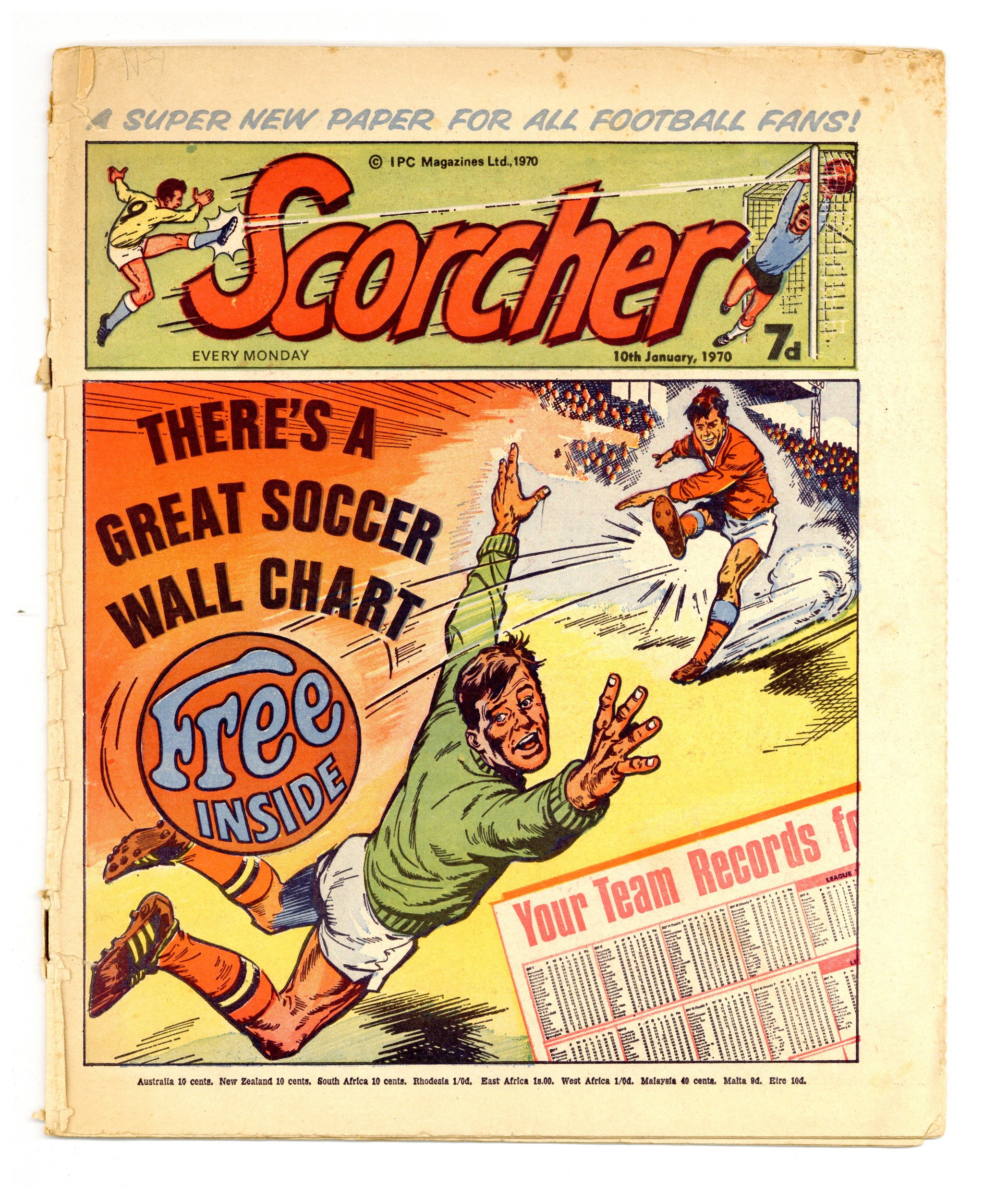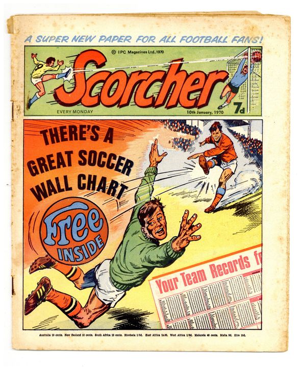 First issue, featuring the beginning of the second series of "Billy's Boots". 77 issues as Scorcher (10 January 1970 to 26 June 1971) and then merges with SCORE to become Scorcher and Score for 171 issues (3 July 1971 to 5 October 1974) and finally merges with Tiger to become TIGER and Scorcher for 300 issues (12 October 1974 to 30 August 1980).