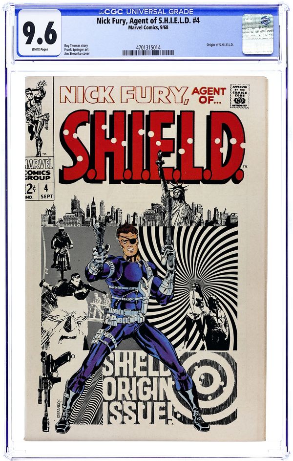 Ends Mar 30 9:06 PM CST Bid History 3 bids Current Bid $16 Your Secret Max Bid If you'd like to bid, please log in or register. Cover by Jim Steranko. SHIELD origin retold in "And Now It Begins...', script by Roy Thomas (plot, dialogue) and Frank Springer (plot), art by Frank Springer; HYDRA repeatedly tries to murder Nick Fury before he can recruited to head SHIELD; The agent in charge of the operation, Agent L, is executed for his failure by Agent H; After reminiscing about his days in WW2, Fury meets Tony Stark, who introduces him to the SHIELD board of directors, then shows him a film detailing HYDRA's operations; After Fury uncovers a bomb in the room and dispatches it, along with the spy who planted it, he realizes the danger facing the free world and takes the job. Frank Springer's 1st Marvel work. 36 pgs., full color. $0.12. Cover price $0.12.