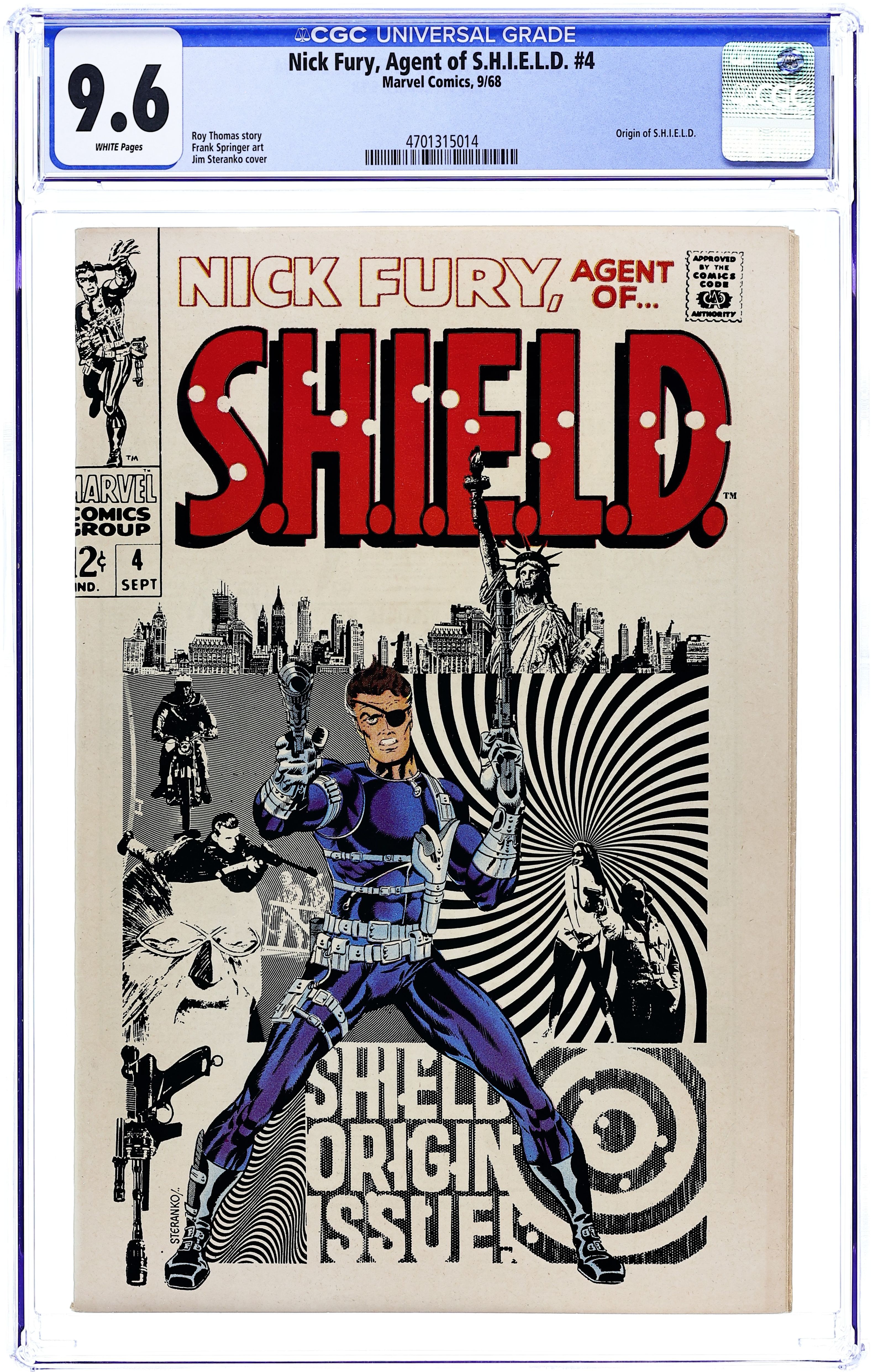 Cover by Jim Steranko. SHIELD origin retold in "And Now It Begins...', script by Roy Thomas (plot, dialogue) and Frank Springer (plot), art by Frank Springer; HYDRA repeatedly tries to murder Nick Fury before he can recruited to head SHIELD; The agent in charge of the operation, Agent L, is executed for his failure by Agent H; After reminiscing about his days in WW2, Fury meets Tony Stark, who introduces him to the SHIELD board of directors, then shows him a film detailing HYDRA's operations; After Fury uncovers a bomb in the room and dispatches it, along with the spy who planted it, he realizes the danger facing the free world and takes the job. Frank Springer's 1st Marvel work. 36 pgs., full color. $0.12. Cover price $0.12.