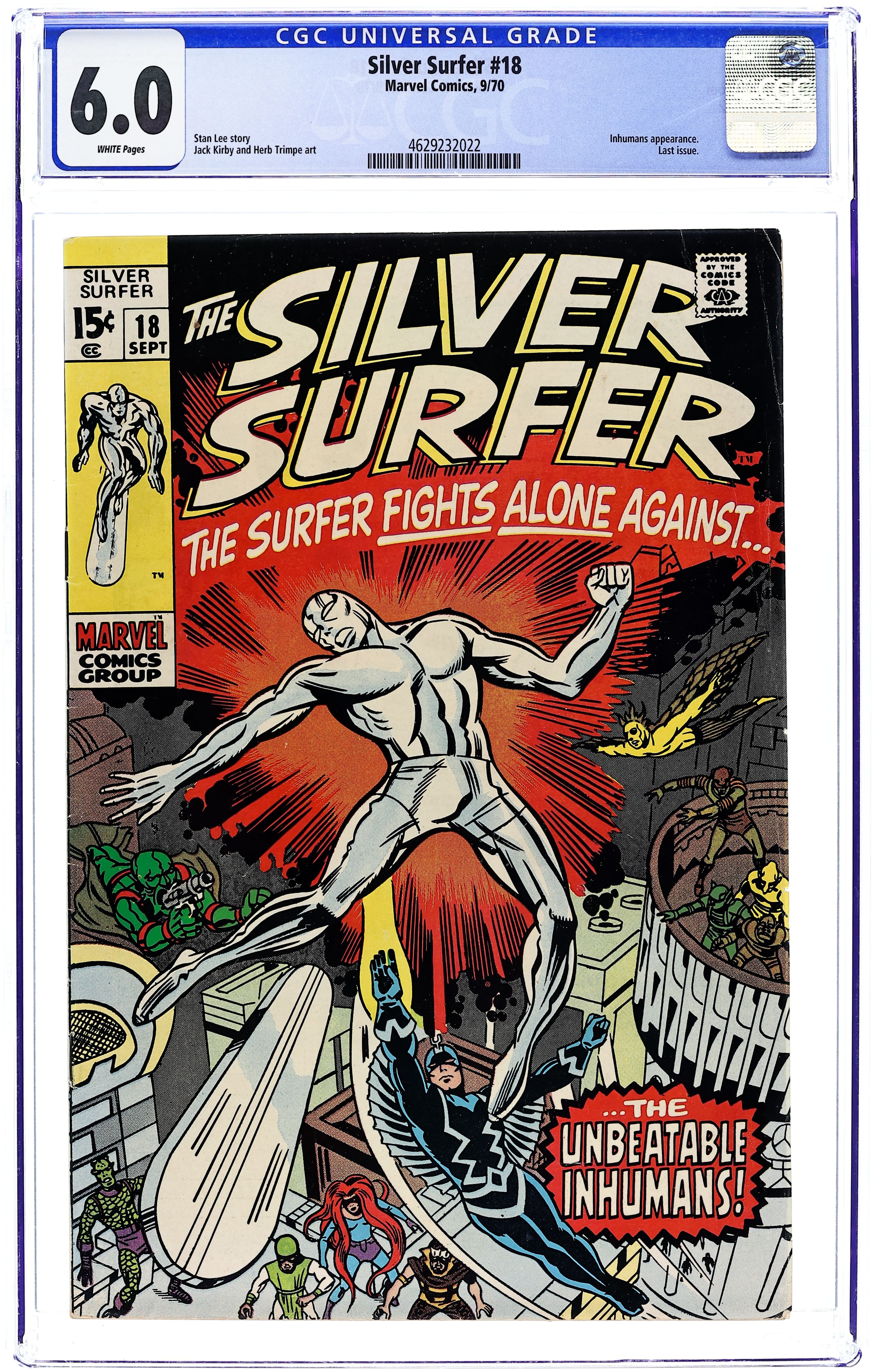"To Smash the Inhumans!" Final issue of the series. Guest-starring the Inhumans. Script by Stan Lee. Pencils by Jack Kirby. Inks by Herb Trimpe. Cover by Herb Trimpe (with possible layouts or pencils by Marie Severin.) The Silver Surfer renounces his peaceful ways and decides to fight against mankind instead of with them! And despite their best efforts, the Inhumans cannot convince the cosmic sky-rider otherwise! Unfortunately, the story ends on a cliffhanger as the series was canceled. Appearances by Black Bolt, Medusa, Gorgon, Karnak, Triton, and Maximus. (Note: The surfer's next chronological appearance comes in Webspinners Tales of Spider-Man (1999) #4 where the dangling plotline (from 29 years earlier) is at last addressed.) 32 pages. Cover price $0.15.