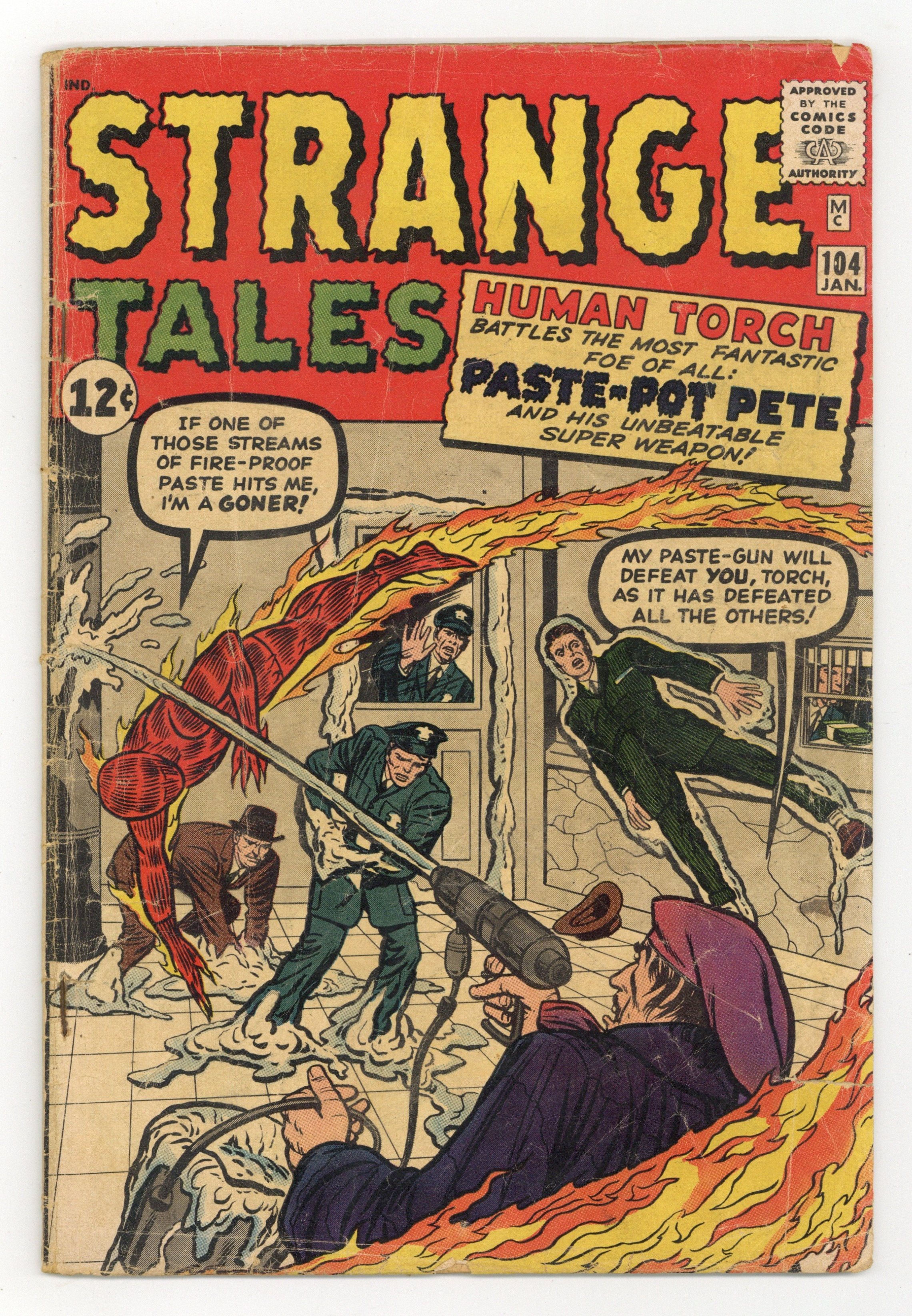 Cover pencils by Jack Kirby, inks by Dick Ayers. First appearance of Paste-Pot Pete (later called the Trapster) in "Paste-Pot Pete!", script by Stan Lee (plot) and Larry Lieber (script), pencils by Jack Kirby, inks by Dick Ayers; Human Torch stops Paste-Pot Pete from stealing an experimental missile from the military. "Venus!" text story. "Markham's Magic Crayon!", script by Stan Lee (plot) and Larry Lieber (script), art by Paul Reinman; A greedy factory owner fires a worker who claims to have made a magic crayon; He finds that the crayon really is magic, giving him the ability to draw fabulously. "The Frog-Man!", script by Stan Lee, art by Steve Ditko; An evil king is turned into a frog by a sorcerer; He hibernates for centuries hoping that the future will hold a cure, but Halloween costumes make him think that humans are now giant frogs and he goes to sleep forever. 36 pgs., full color. Cover price $0.12.