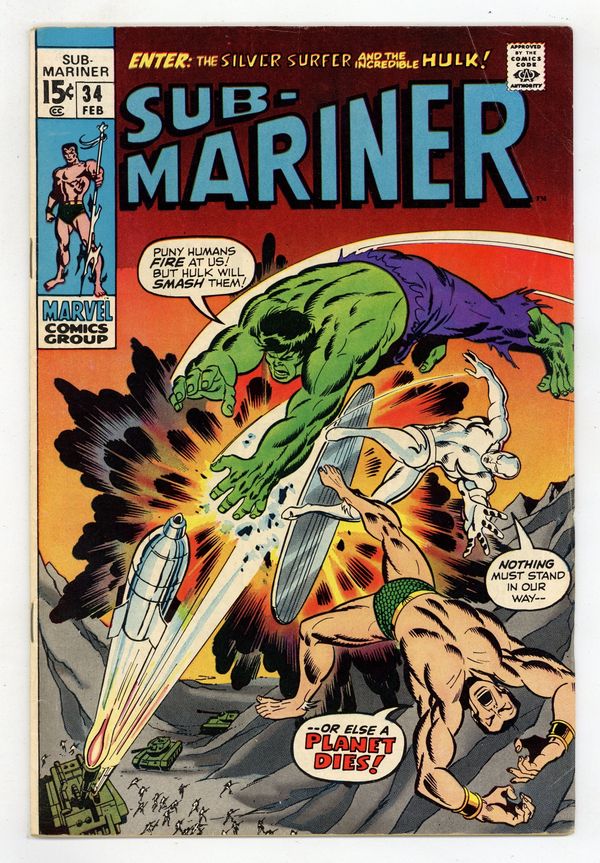 Cover by Sal Buscema. "Titans Three!" part one of two, script by Roy Thomas, pencils by Sal Buscema, inks by Jim Mooney; Sub-Mariner, Silver Surfer and the Hulk help the citizens of a small Central American country overthrow El General; Prelude (with #35) to 1st Defenders story. 36 pgs., full color. $0.15. Cover price $0.15.