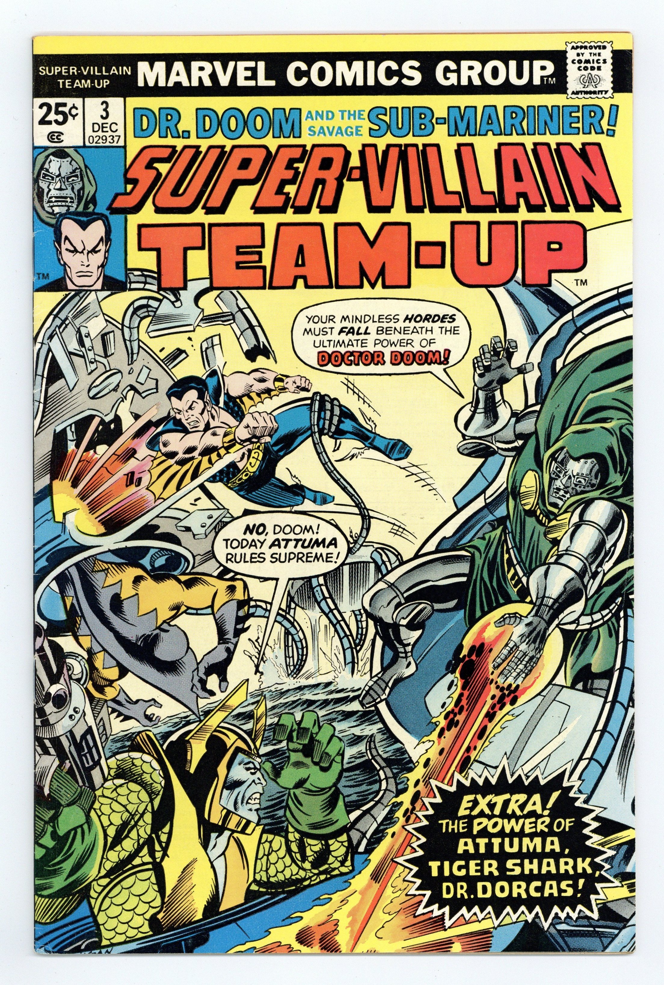 "If Vengeance Fails!" Part 3 of 3. Script by Jim Shooter. Pencils by George Evans. Inks by Jack Abel. Cover by Ed Hannigan and Joe Sinnott. In heartbreaking fashion the Sub-Mariner's long-time friend has perished at the hands of Dr. Dorcas. And now the enraged Avenging Son is ready to avenge! But Doctor Doom thinks a hasty retreat would be more prudent! So the Prince of Atlantis and the Latverian monarch escape to Castle Doom to plot their final assault on Attuma and Hydro-Base! And several hours later, the powerful pair strikes! Doctor Doom attacks by air and Prince Namor by sea! Do Attuma, Dr. Dorcas, and Tiger Shark stand a chance against the fighting mad Sub-Mariner? Imperious Rex! Deaths of Dr. Dorcas and Saru-San. Cameo appearance by Tamara. (Notes: Attuma returns in Avengers 154. Tiger Shark appears next in Ms. Marvel (1st series) 15. The letters page includes letters from comics historian Peter Sanderson and cartoonist Jay Zilber, respectively. This issue contains a full-page ad for Hostess Fruit Pies featuring the Hulk vs. the Abomination and Wendigo.) 32 pages Cover price $0.25.