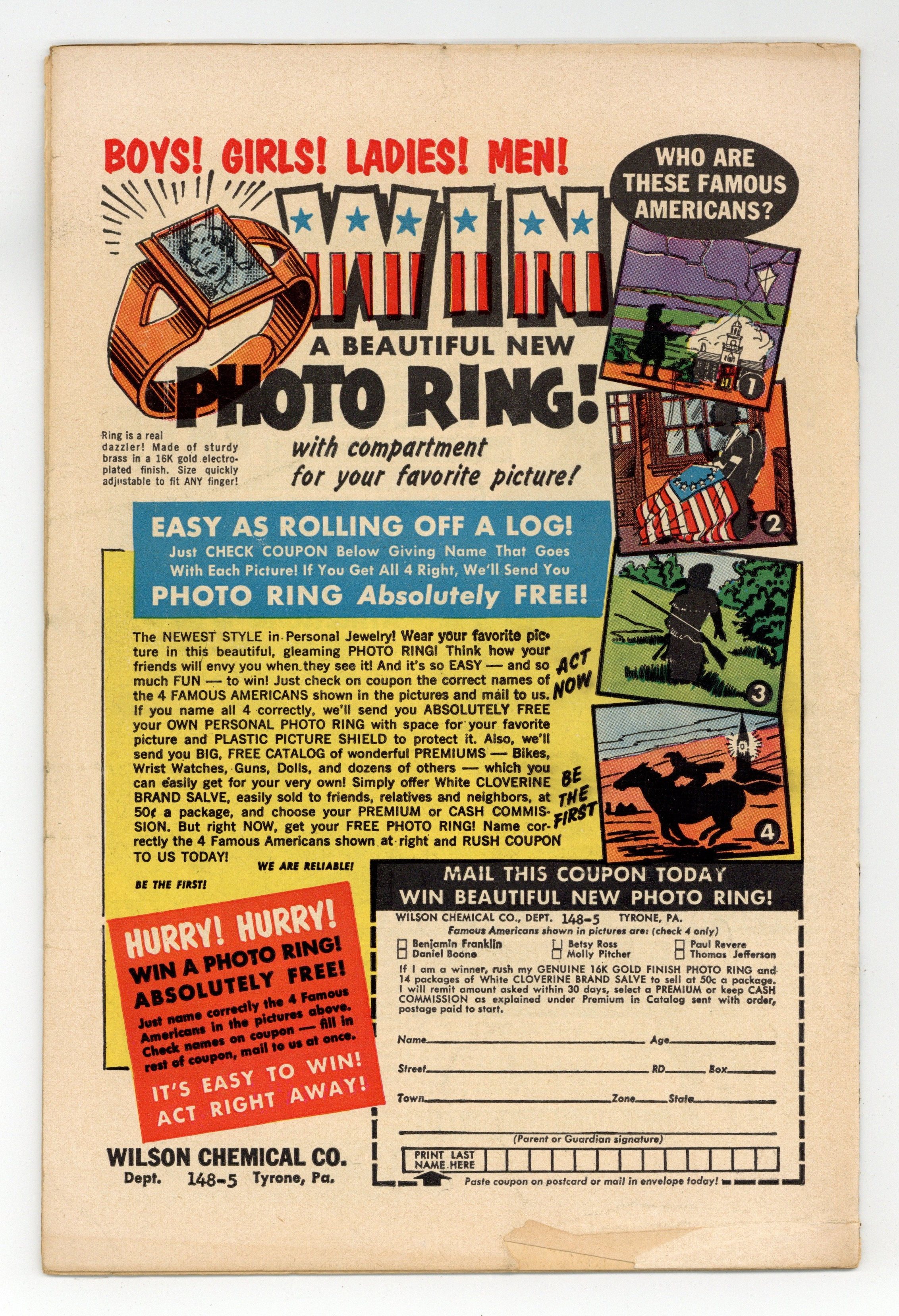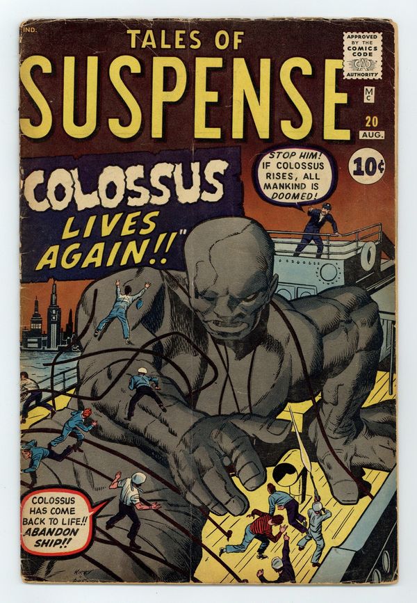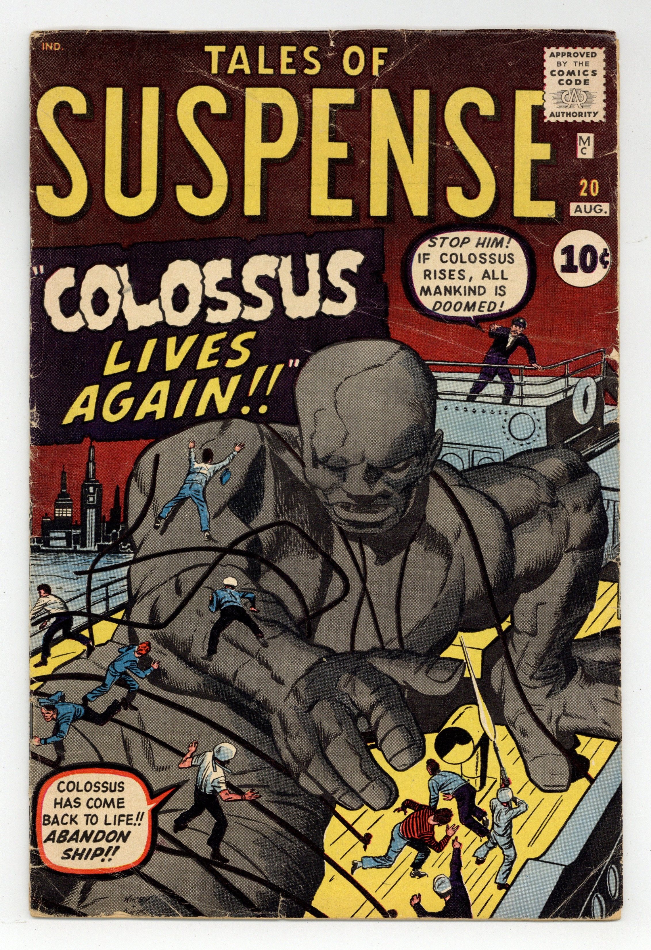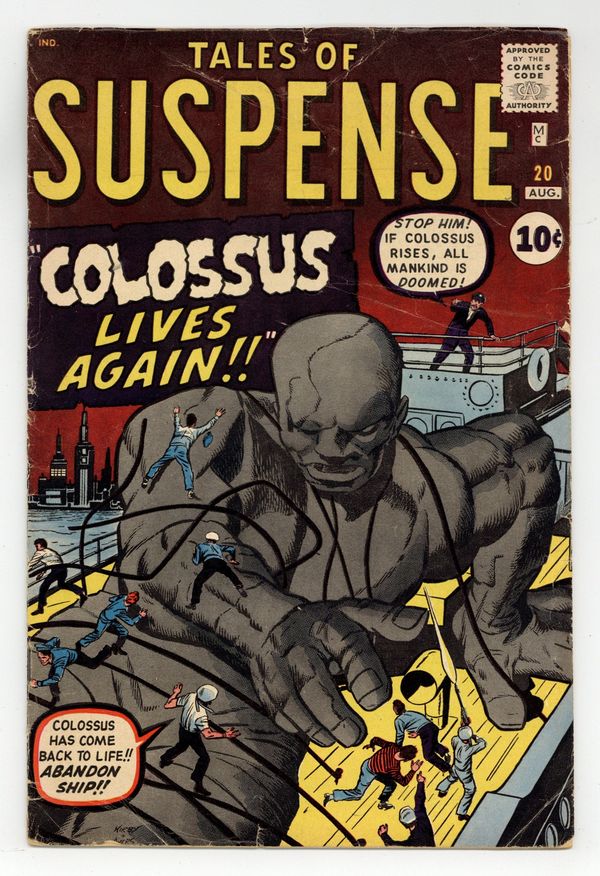 Cover pencils by Jack Kirby, inks by Dick Ayers. "Colossus Lives Again," pencils by Jack Kirby, inks by Dick Ayers; The crab-creatures of Cancrius III come back to try to take over the earth and begin by taking control of Colossus again; Bob O'Bryan, a scenery designer, comes up with the idea of creating a plaster of Paris creature to trick the crab-creatures into it taking over. "Weather Man" text story, art by Joe Maneely. "The Rocking Horse," art by Paul Reinman; A lame boy in a poor house asks for a rocking horse from charity, enraging his parents; When their house is destroyed in an earthquake the horse saves the boy, showing the value of love. "The Bomb," art by Steve Ditko; A threatening object that appears to be a bomb drops from the sky and lands in New York City; The object even emits ticking sounds that lead people to believe they are in imminent danger and so the city the evacuated. 36 pgs., full color. $0.10. Cover price $0.10.
