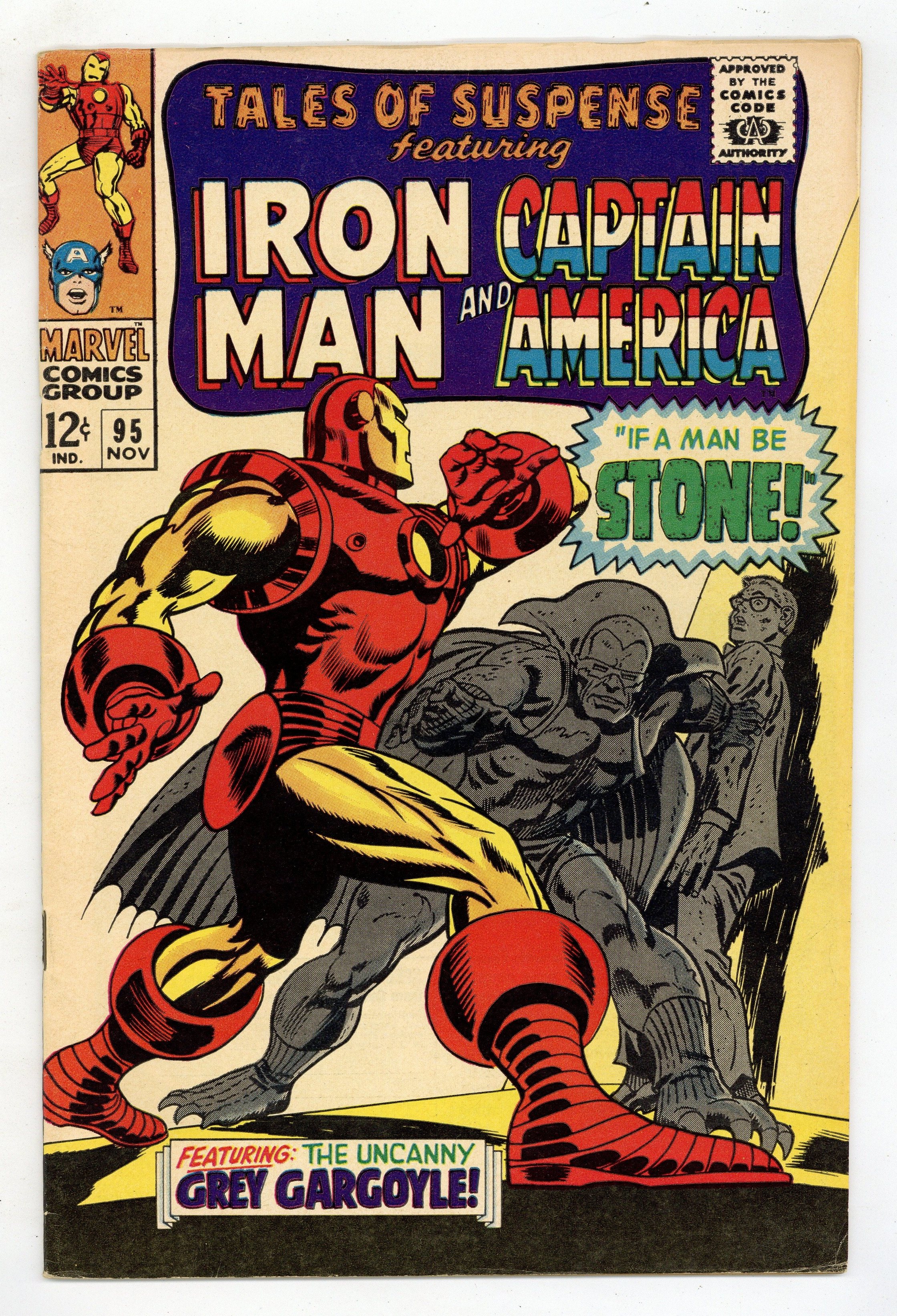 Tags: Marvel Legacy Numbering: Captain America (part 95), Marvel Legacy Numbering: Tales of Suspense (part 95), Captain America, Iron Man$23.00Cover pencils by Gene Colan, inks by Frank Giacoia. "If A Man Be Stone!", script by Stan Lee, pencils by Gene Colan, inks by Frank Giacoia; Tony Stark discovers that his factory has been broken into while he was in Vietnam; The culprit is a young SHIELD agent named Jasper Sitwell; Sitwell explains that Nick Fury has assigned him to guard Stark's factory because it makes many of SHIELD's devices; The Grey Gargoyle breaks into Stark Industries, turning guards to stone. "A Time to Die - A Time to Live!", script by Stan Lee, pencils by Jack Kirby, inks by Joe Sinnott; Captain America searches for a fugitive gang leader; He thinks about how this is going to be his last mission, and theres a flashback that shows Steve Rogers getting a call from SHIELD Agent 13 that he likes; Cap reveals his identity as Steve Rogers; Steve thanks Tony Stark for everything he did for the Avengers. Ad for Merry Marvel Marching Society. 36 pages, full color. Cover price $0.12.